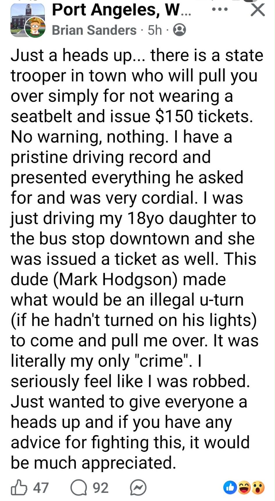 He has since transferred to Clallam County, and is quickly gaining a local reputation as a no-nonsense state trooper.