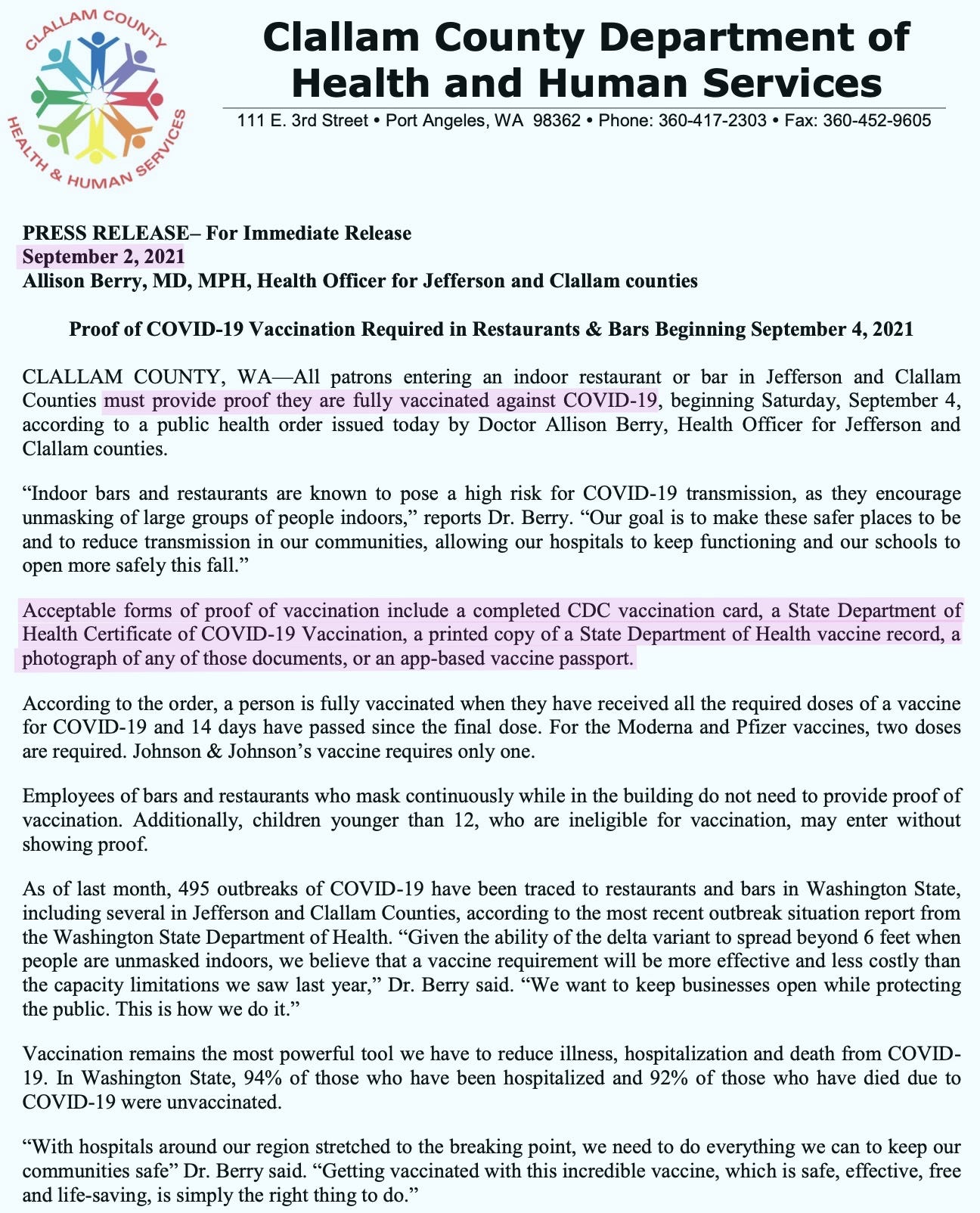 “All patrons entering an indoor restaurant or bar in Jefferson and Clallam Counties must provide proof they are fully vaccinated against COVID-19.”