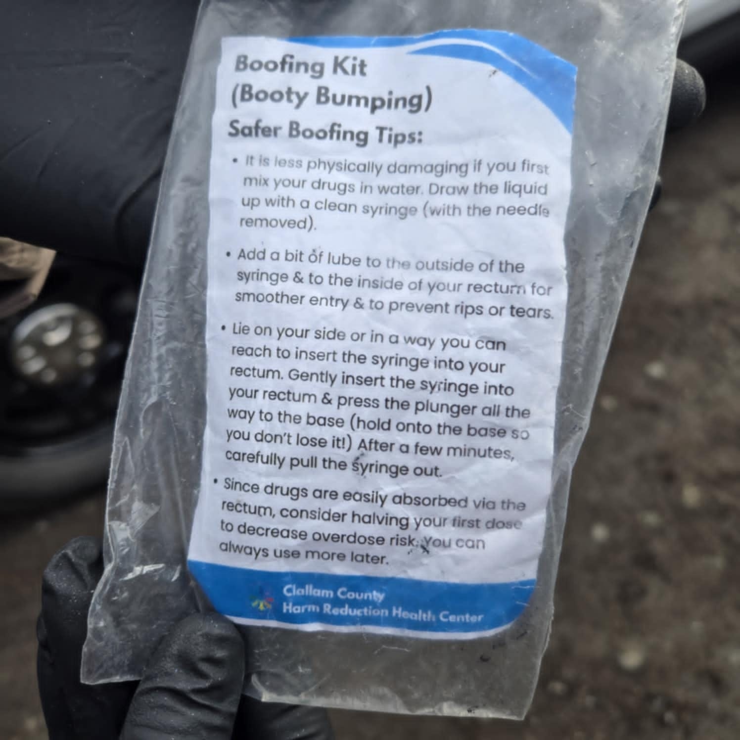 A Clallam County Health and Human Services–branded “boofing kit” — complete with step-by-step instructions for rectal drug use — is now part of the county’s harm-reduction inventory.