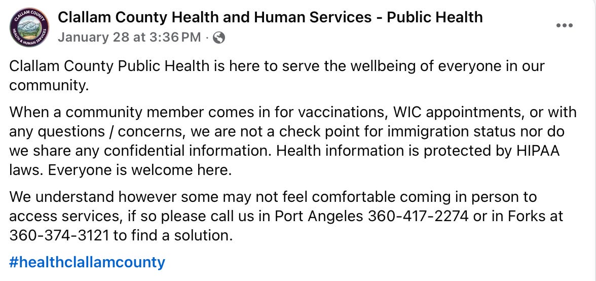 Clallam County Health and Human Services recently announced on social media that it does not check immigration status for residents seeking county health services, including vaccinations.