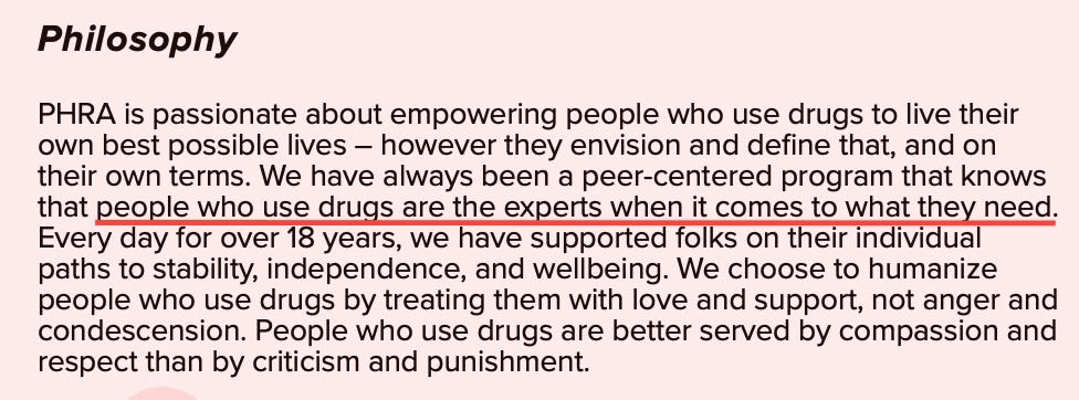 PHRA openly states it supports people who use drugs “however they envision and define” their lives — explicitly rejecting criticism or deterrence.