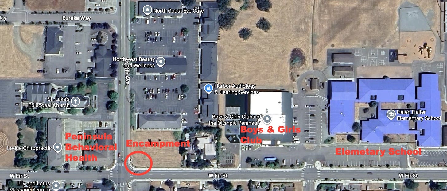 The encampment was across from Peninsula Behavioral Health’s Sequim location, half a block from the Boys & Girls Club, and a block from the Elementary School.