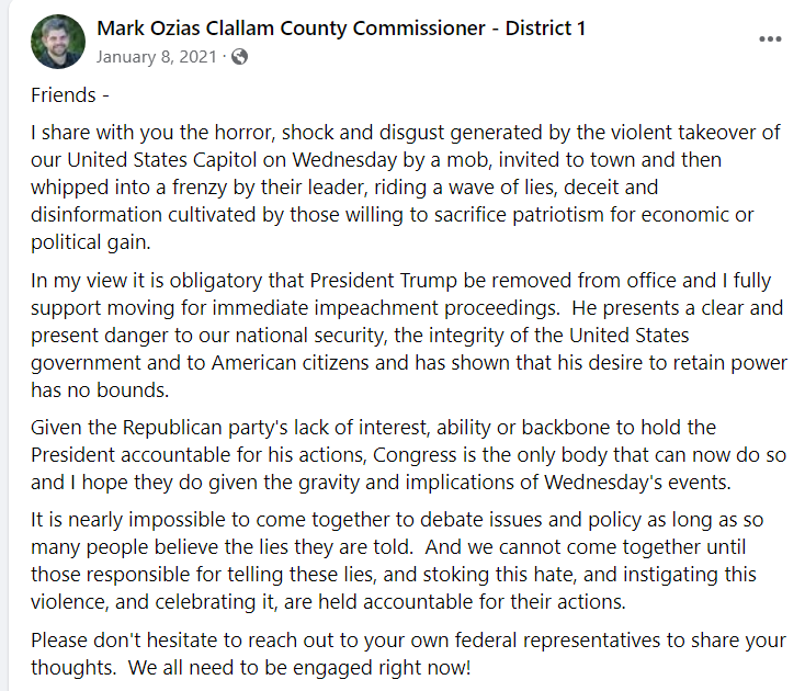 The Facebook post, authored by Commissioner Mark Ozias, is over three years old. The offender — accused of lying, deceit, and disinformation — is a national political figure.