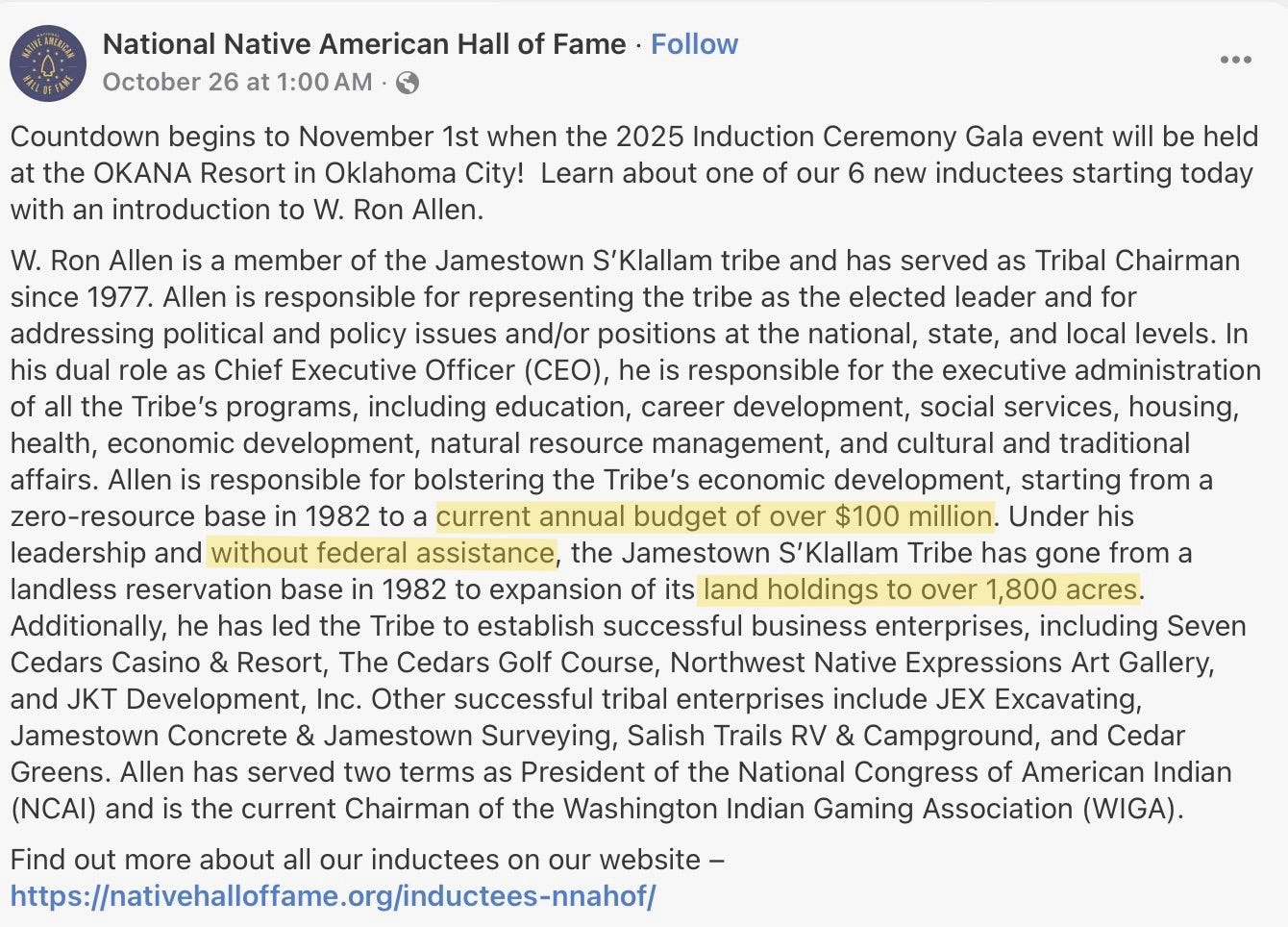 Because locally, Chairman Ron Allen has stated the Tribe has an annual budget of over $100 million, for just over 200 members.