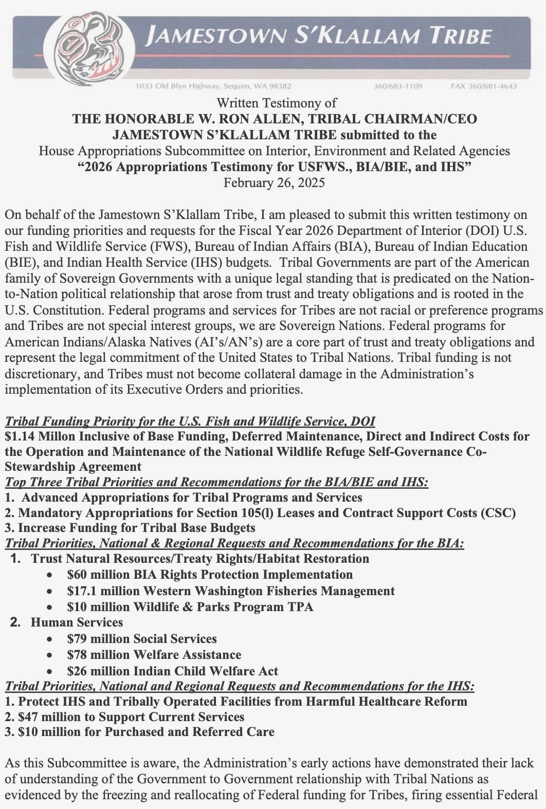 In federal testimony, the Tribe emphasizes funding needs, service gaps, and the importance of federal investment.