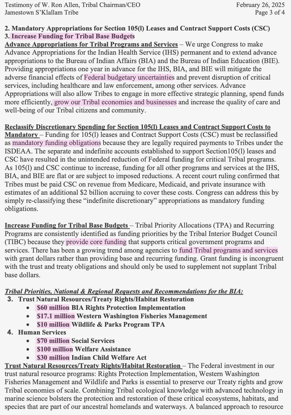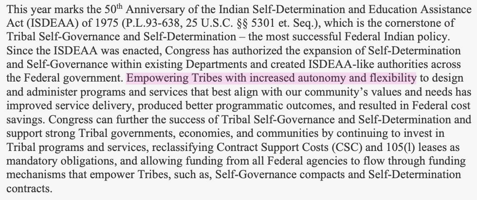 The Jamestown Corporation’s testimony emphasizes “self-governance,” “autonomy,” and the expansion of tribal control over federally managed lands and programs.