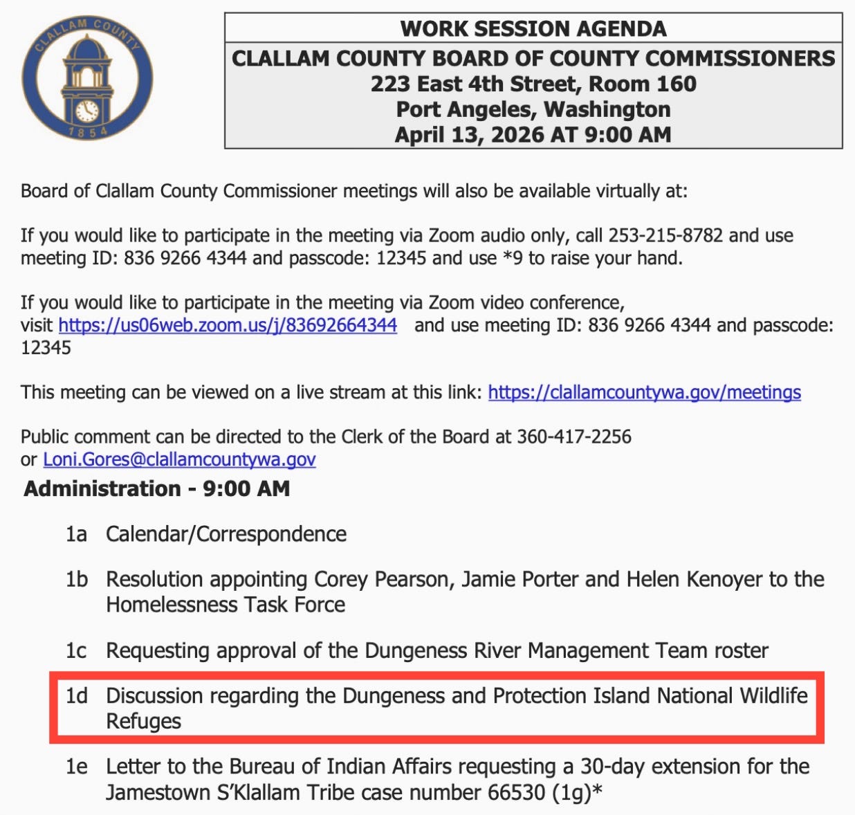 Today at 9:00 AM, Clallam County Commissioners will consider sending a letter supporting the transfer of these refuges to the Tribe.