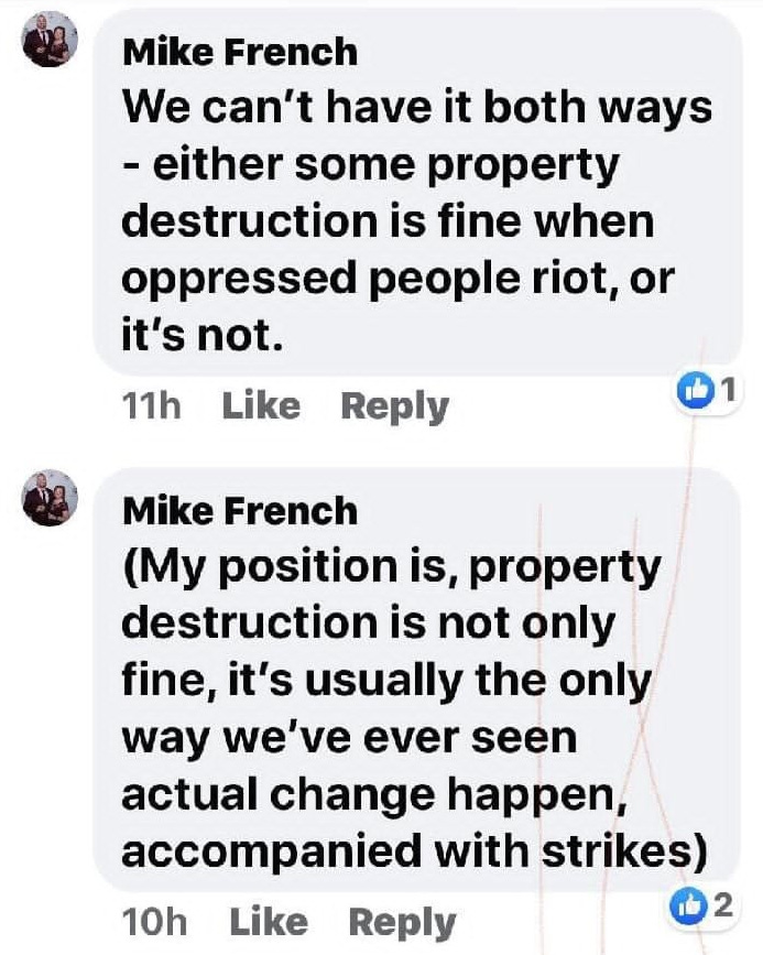 Especially when we have a sitting commissioner, Mike French, who has publicly suggested that property destruction can be justified—that sometimes it’s “the only way we’ve ever seen actual change happen.”