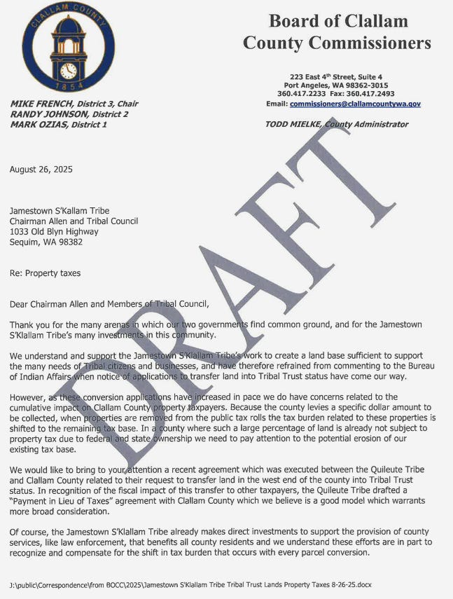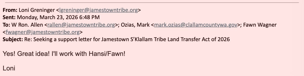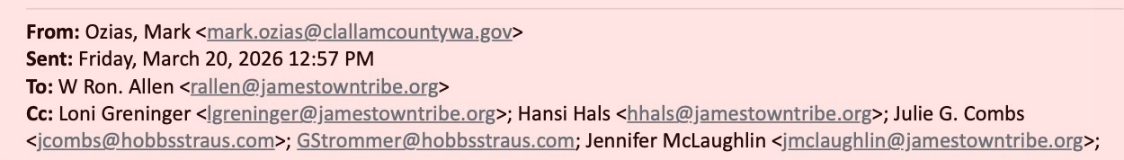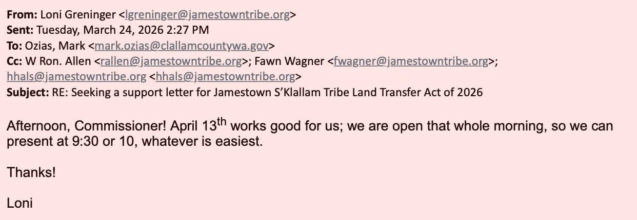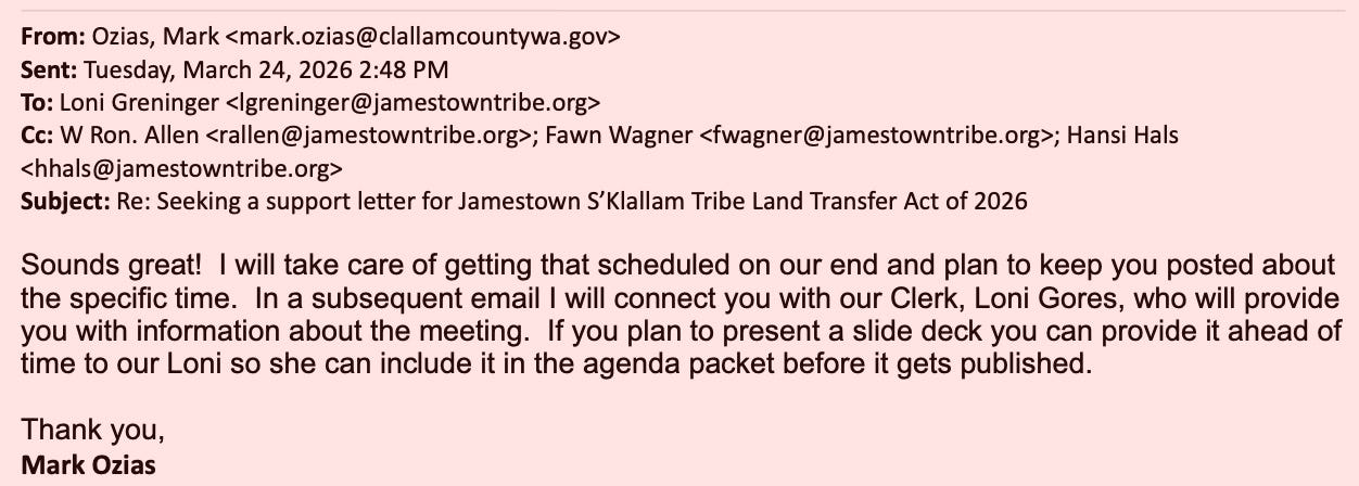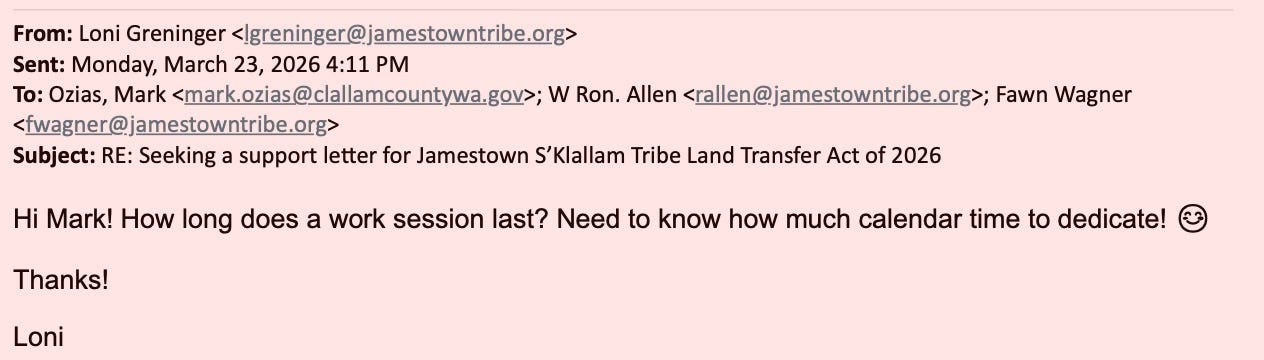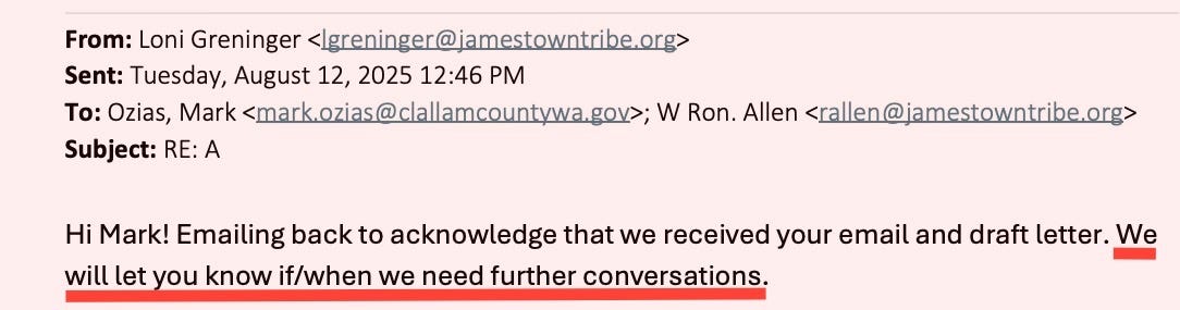 For eight months, Clallam County’s request for a simple conversation about taxes has been met with silence. But when the Jamestown Corporation wants something—letters of support, land transfers, legislative backing—the machinery of local government moves instantly. Emails show not just cooperation, but deference. And now, as the Commissioners prepare to discuss a response to the BIA—possibly for the first time in over a decade—the public is left with a fundamental question: who is really leading Clallam County?