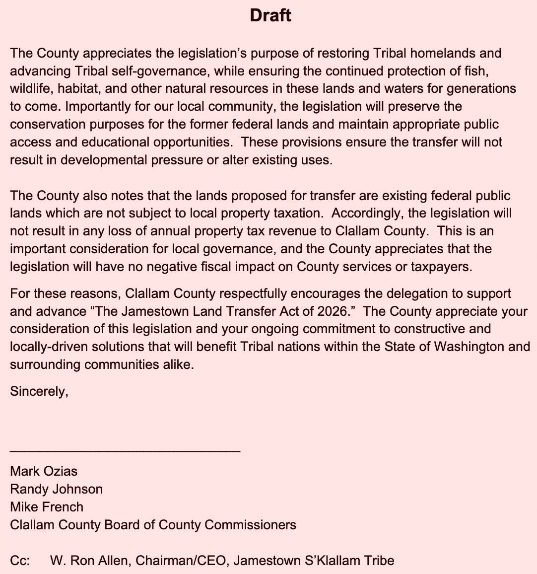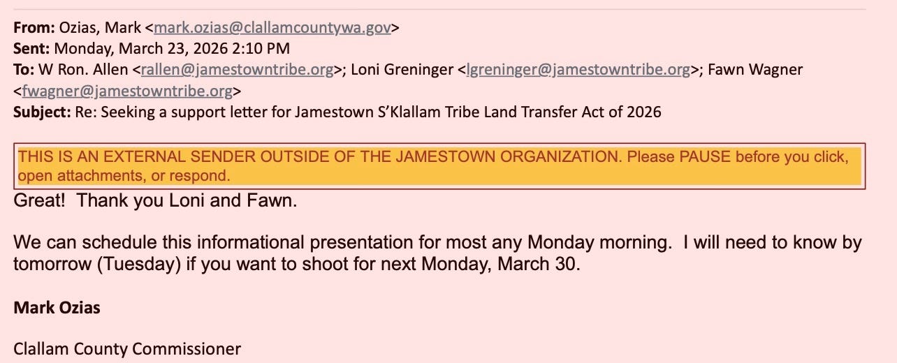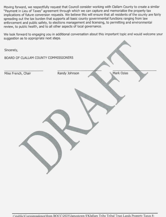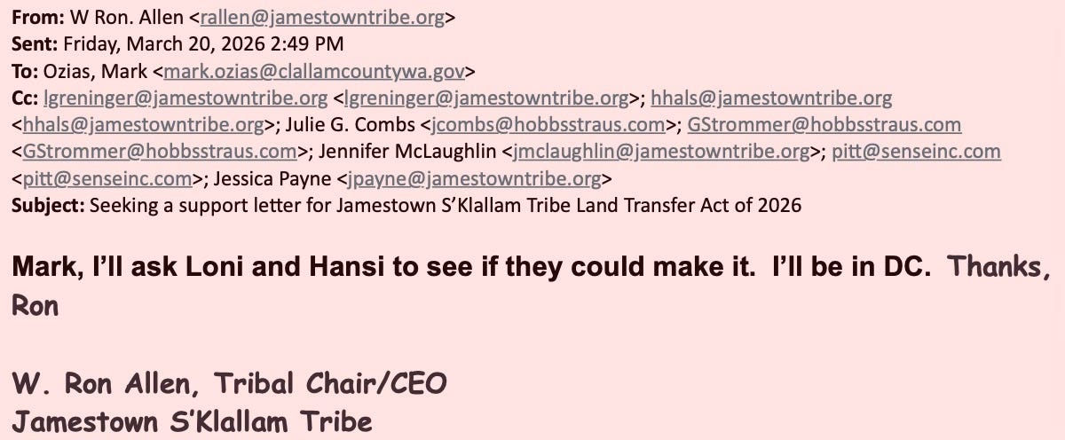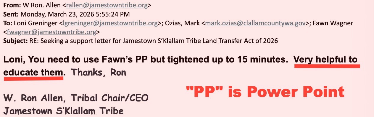 For eight months, Clallam County’s request for a simple conversation about taxes has been met with silence. But when the Jamestown Corporation wants something—letters of support, land transfers, legislative backing—the machinery of local government moves instantly. Emails show not just cooperation, but deference. And now, as the Commissioners prepare to discuss a response to the BIA—possibly for the first time in over a decade—the public is left with a fundamental question: who is really leading Clallam County?