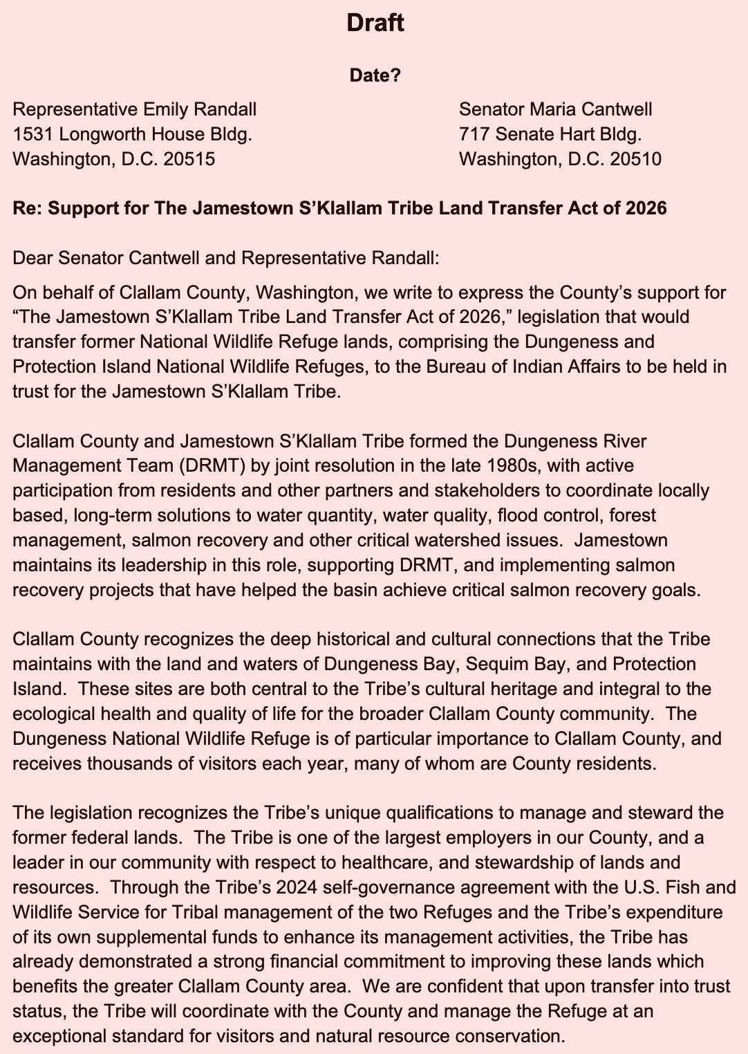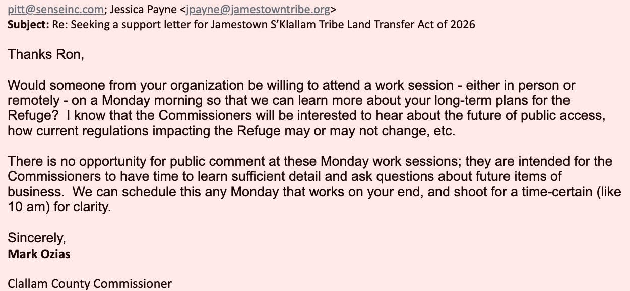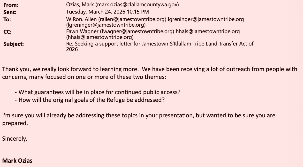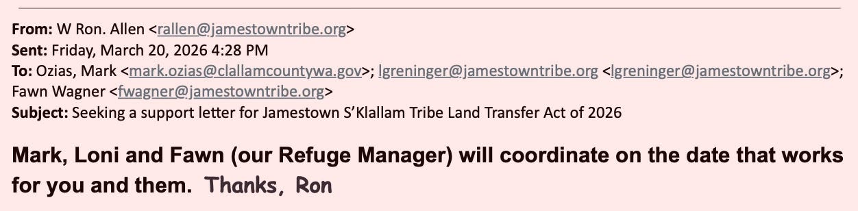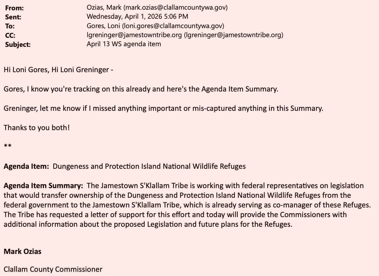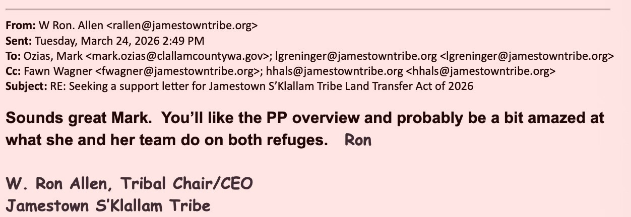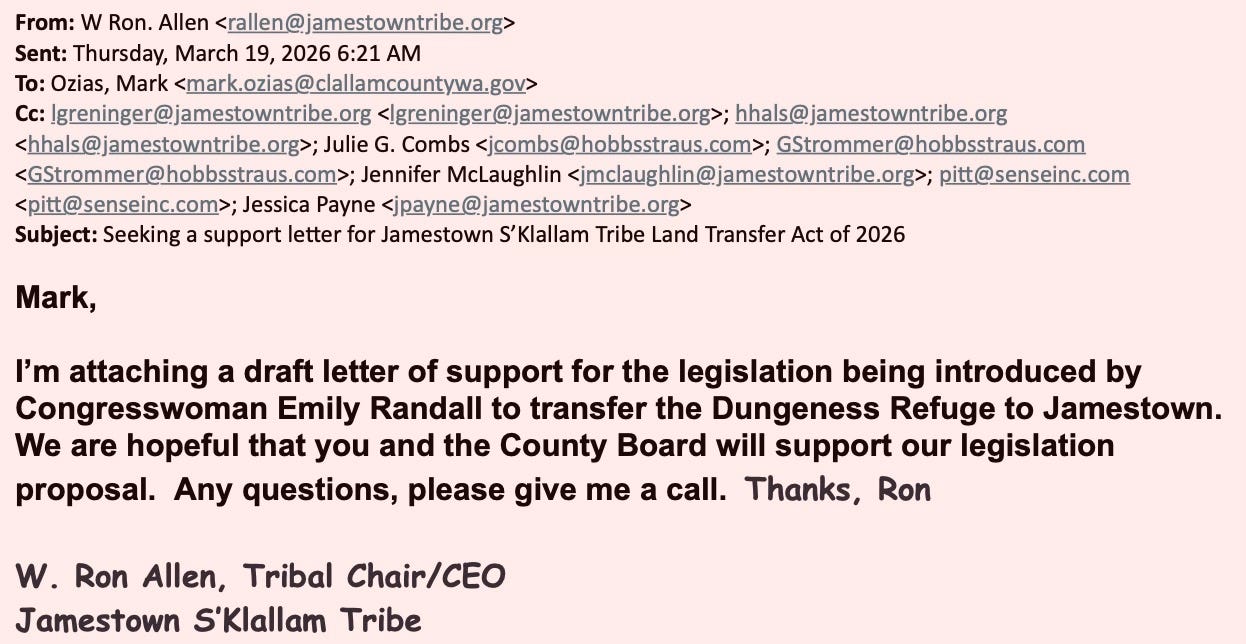 Internal emails show the Jamestown Corporation actively requesting a letter of support for federal legislation that would transfer the Dungeness and Protection Island National Wildlife Refuges into tribal trust.