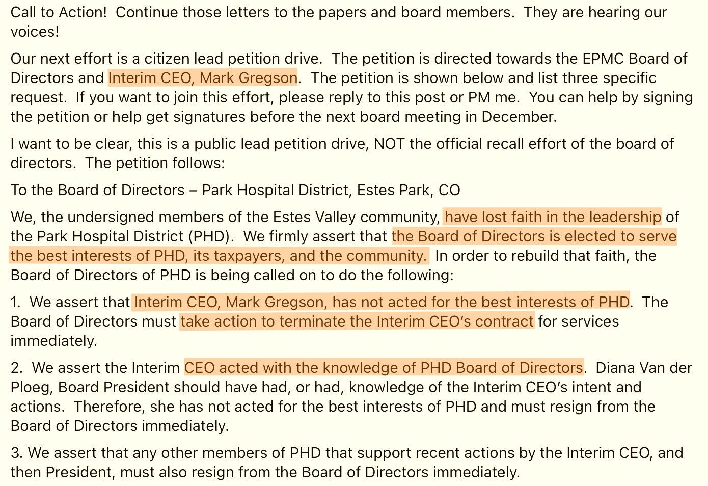 “We assert that Interim CEO, Mark Gregson, has not acted for the best interests of PHD. The Board of Directors must take action to terminate the Interim CEO’s contract for services immediately.” — Citizen petition, Estes Park, CO