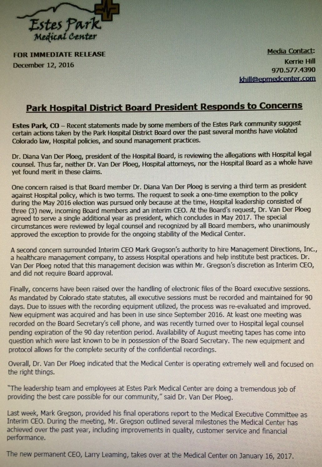 In November 2016, Estes Park residents rallied around a petition calling on the Park Hospital District (PHD) Board to take immediate action. Their demands were blunt: fire interim CEO Mark Gregson and call for the resignation of board president Diana Van Der Ploeg.