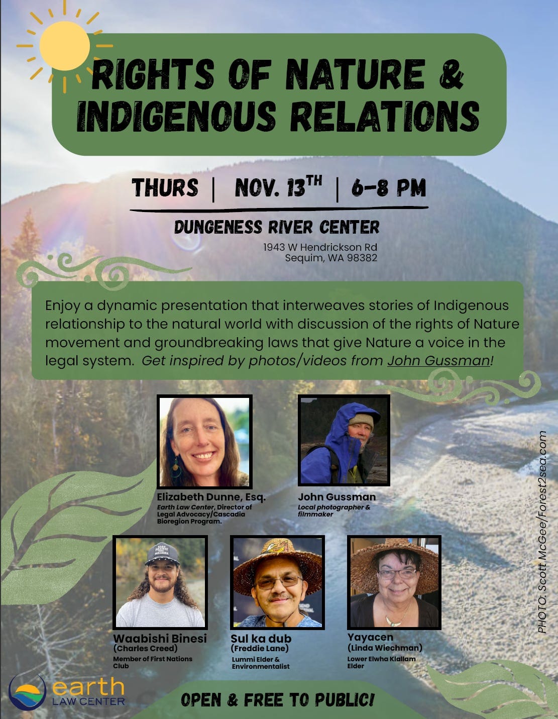 The Jamestown S’Klallam Tribe’s Dungeness River Center is hosting “Rights of Nature and Indigenous Relations,” featuring attorney Elizabeth Dunne of the Earth Law Center — a group pushing to grant legal personhood to elements of nature like rivers, trees, and even wild rice.
