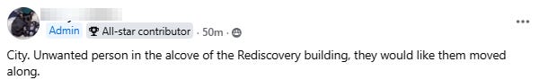 On the scanner this week: an “unwanted person” was reported sleeping in the alcove of the Rediscovery building — and staff wanted them “moved along.”