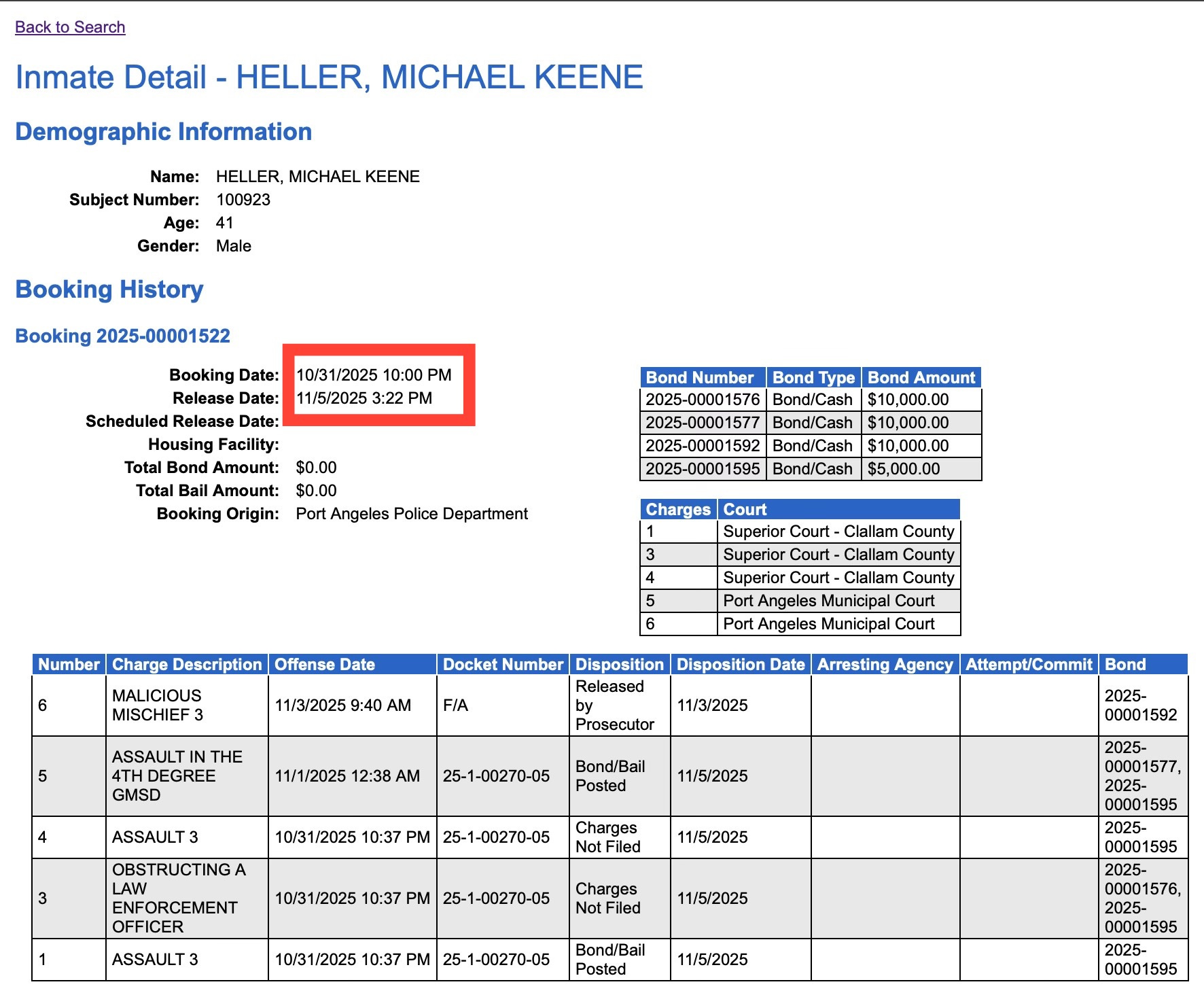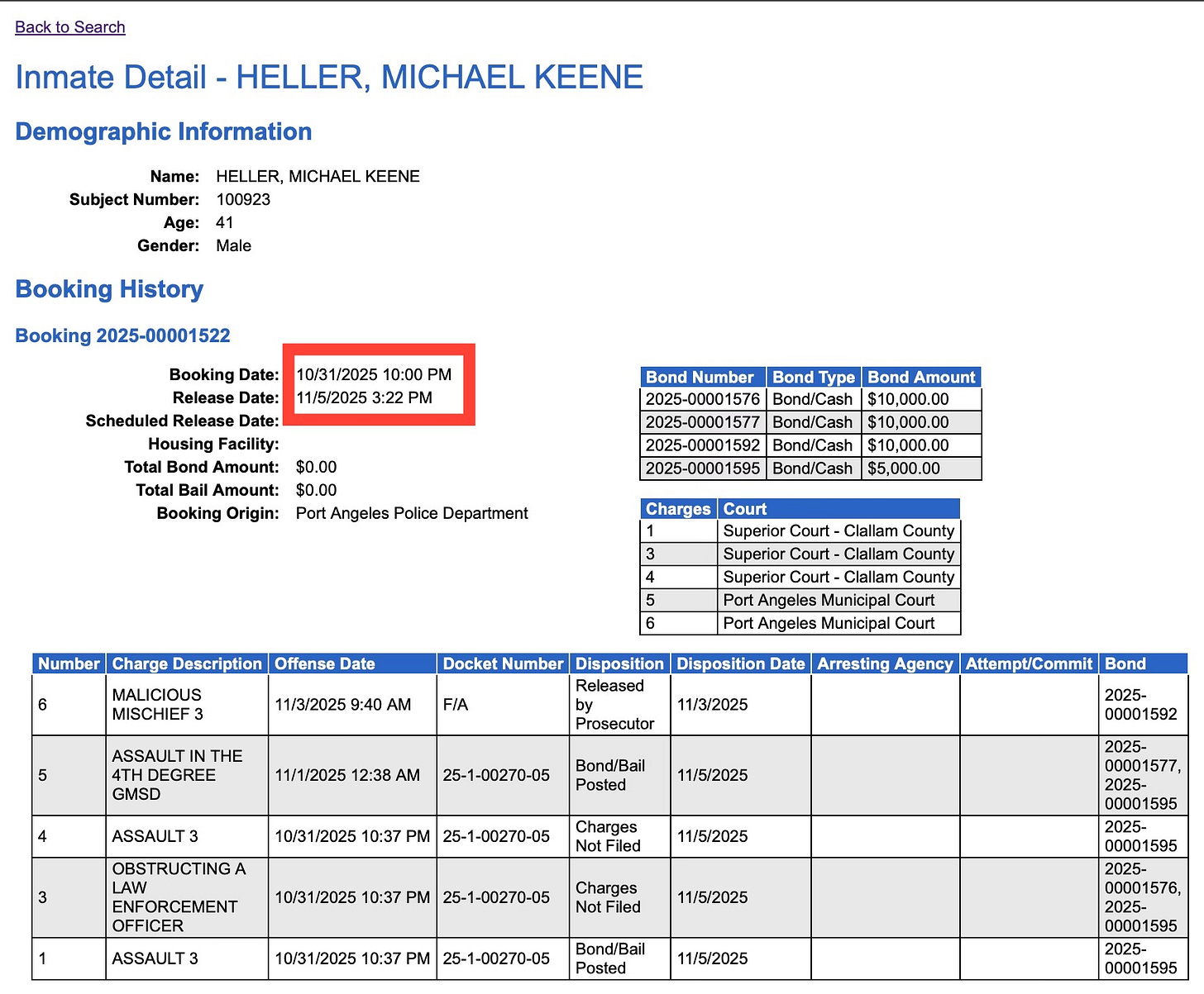 Michael Heller, a man well-known to local law enforcement, was arrested on Halloween for multiple charges — including malicious mischief, assault, and obstructing officers — only to be released from Clallam County Jail after five days.