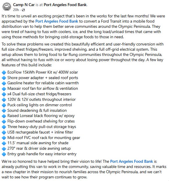 The Port Angeles Food Bank just unveiled a new solar-powered distribution van with dimmable lighting and retractable awnings, explaining they were “tired of coolers, ice and the long load/unload times.”