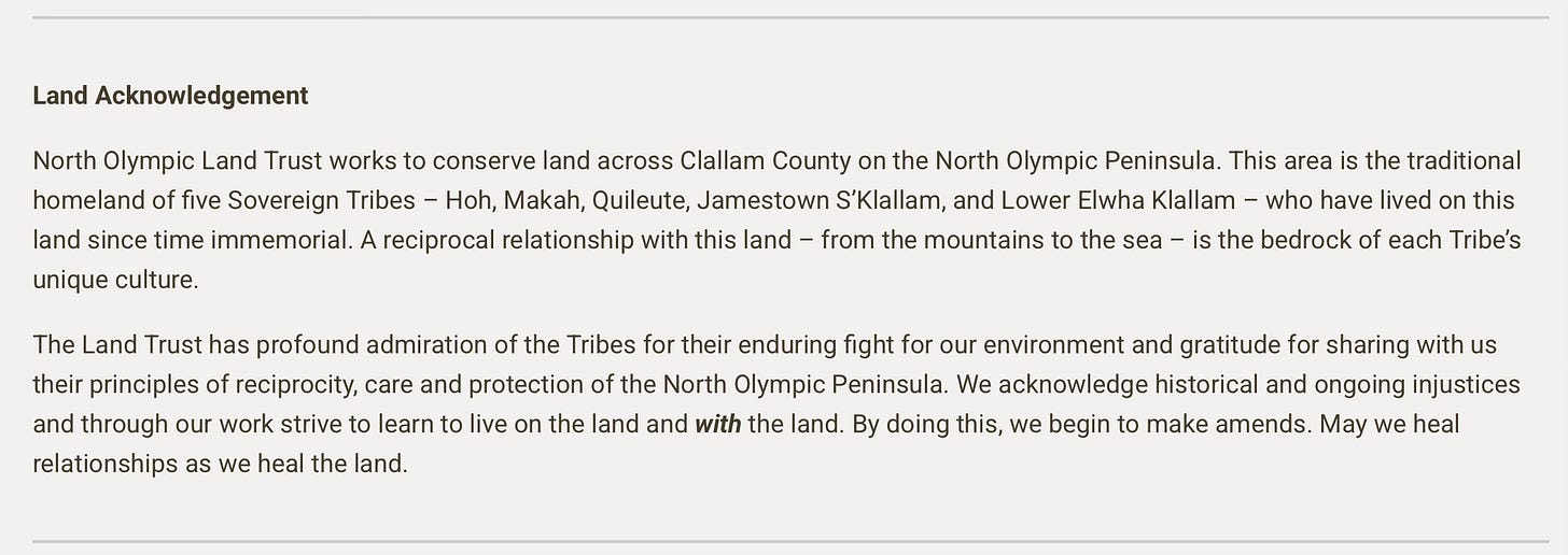 The North Olympic Land Trust references “ongoing historical injustices,” though without clearly spelling out what that means today.