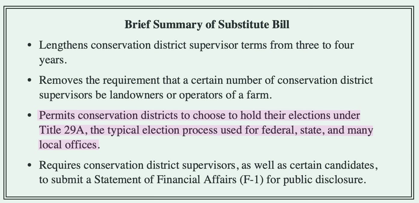 Moving conservation district elections onto the regular fall ballot would require a change in state law.
