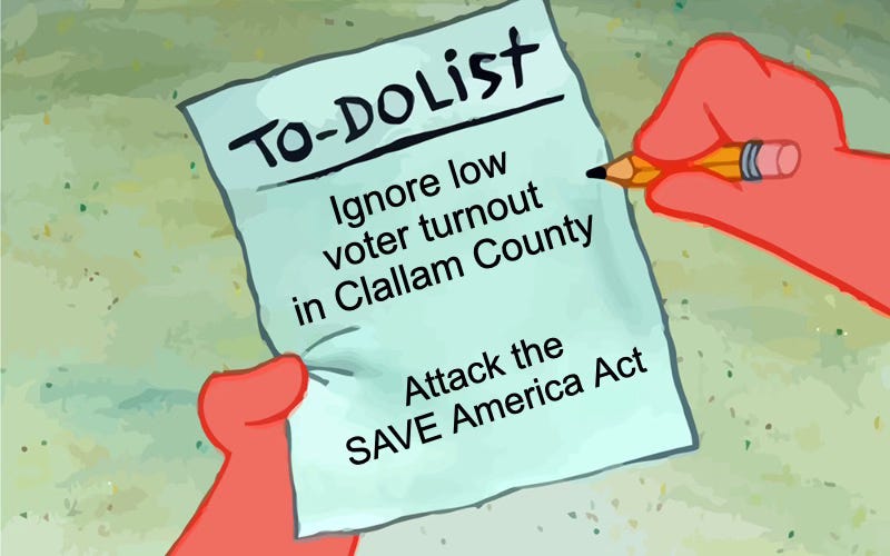While the League of Women Voters of Clallam County is concerned about losing a hypothetical voter base due to potential legislation that requires proof of citizenship, they appear to have no interest in the lackluster turnout for the 2025 general election in Clallam County where less than half of registered voters participated.