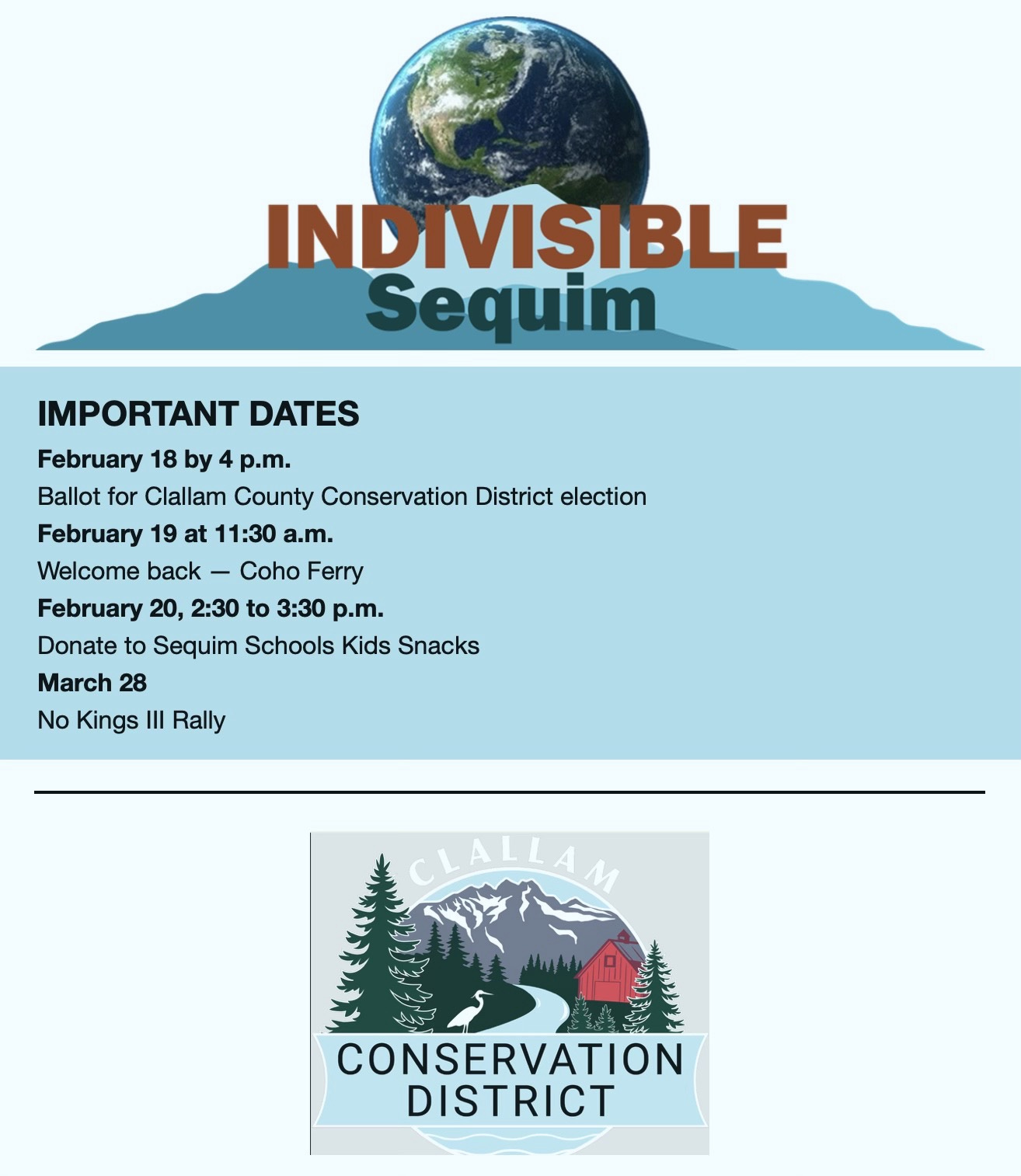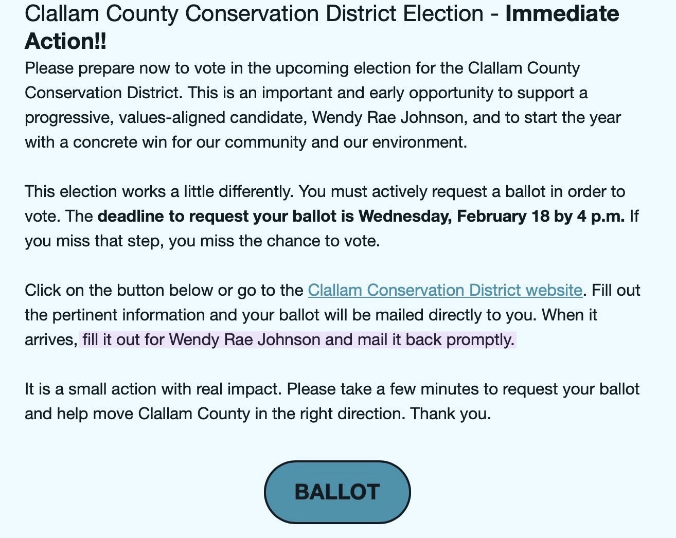 “We are asking that you and others stand with the CCD in election reform. Clallam Conservation District is committed to pursuing election reform with the Washington State Legislature and making future elections more accessible to all voters. If you would like this election on the regular fall ballot, please contact your legislator at 1-800-562-6000.”