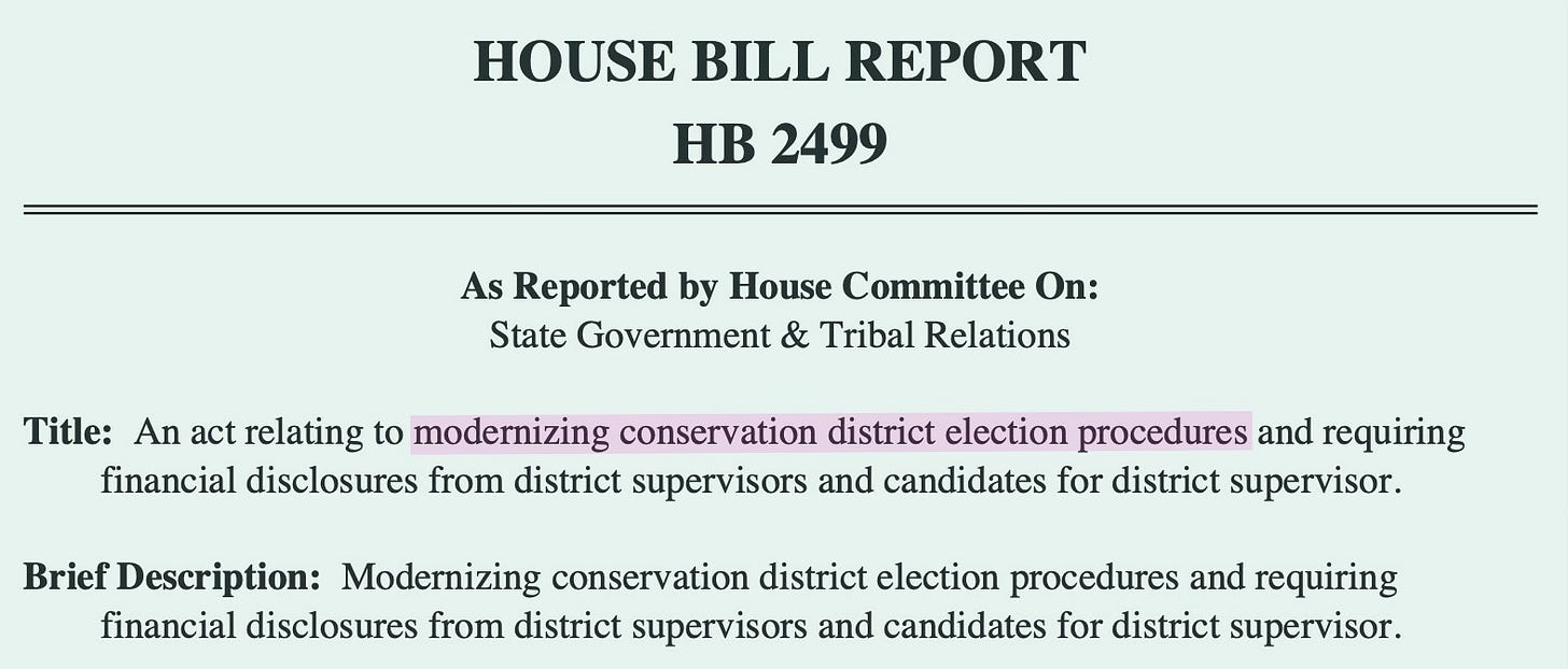 CCD has explained that conservation district elections are governed by Chapter 89.08 RCW and Washington Administrative Code 135.110. They are exempt from Title 29A — the election laws that govern standard county and state races. Elections occur annually in the first quarter and are overseen by the Washington State Conservation Commission.