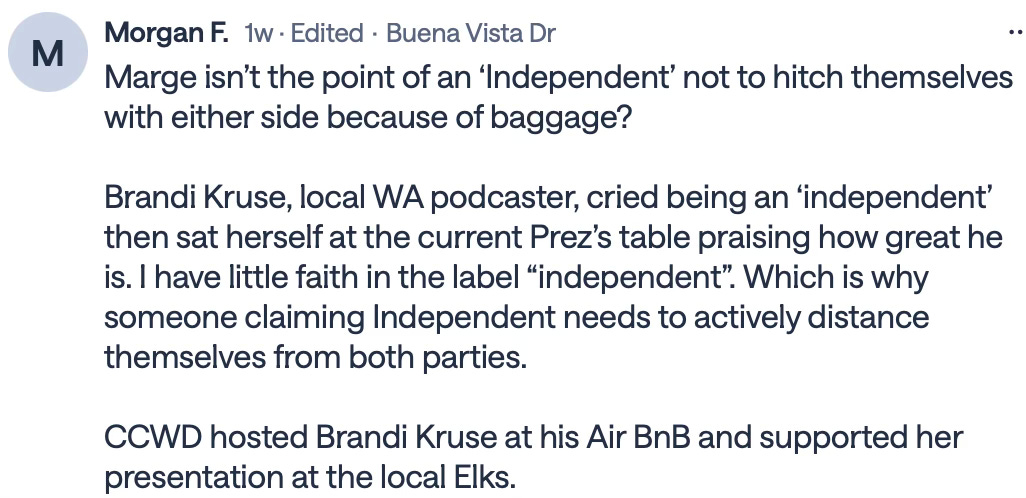 But Morgan’s big reveal wasn’t about policy at all. No, her real concern—her true smoking gun—was that Jake’s campaign manager is me, the editor of CC Watchdog. Her follow-up post explained her distrust of anyone claiming to be “independent,” and then delivered her bombshell: