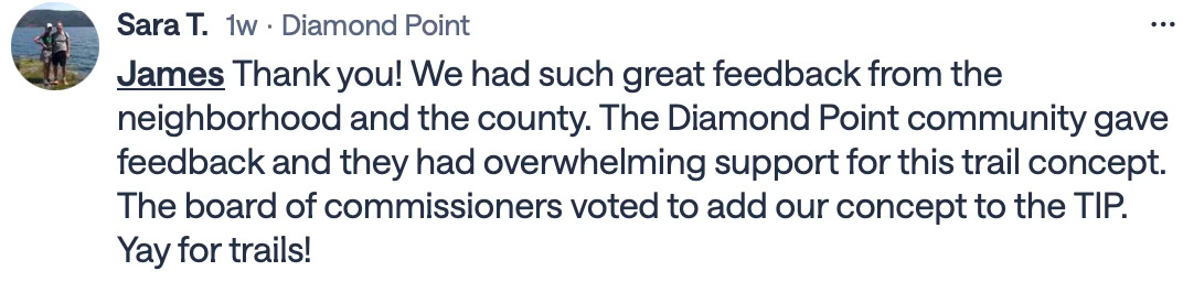A quick scroll through Nextdoor.com tells the story. Diamond Point resident Sara T. posted a celebratory thank-you to Jim Stoffer, proudly announcing that the community gave “overwhelming support” and that commissioners added the idea to the TIP.