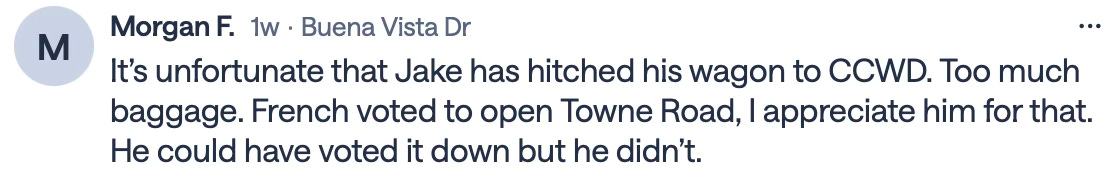 Jake Seegers’ campaign for County Commissioner has gotten a warm response from voters looking for someone who isn’t welded to the political machinery. But it didn’t take long for someone on Nextdoor.com to turn enthusiasm into scandal. This time, the honor fell to Morgan Fairbanks, who popped in to announce her disappointment that Jake had “hitched his wagon to CCWD.”