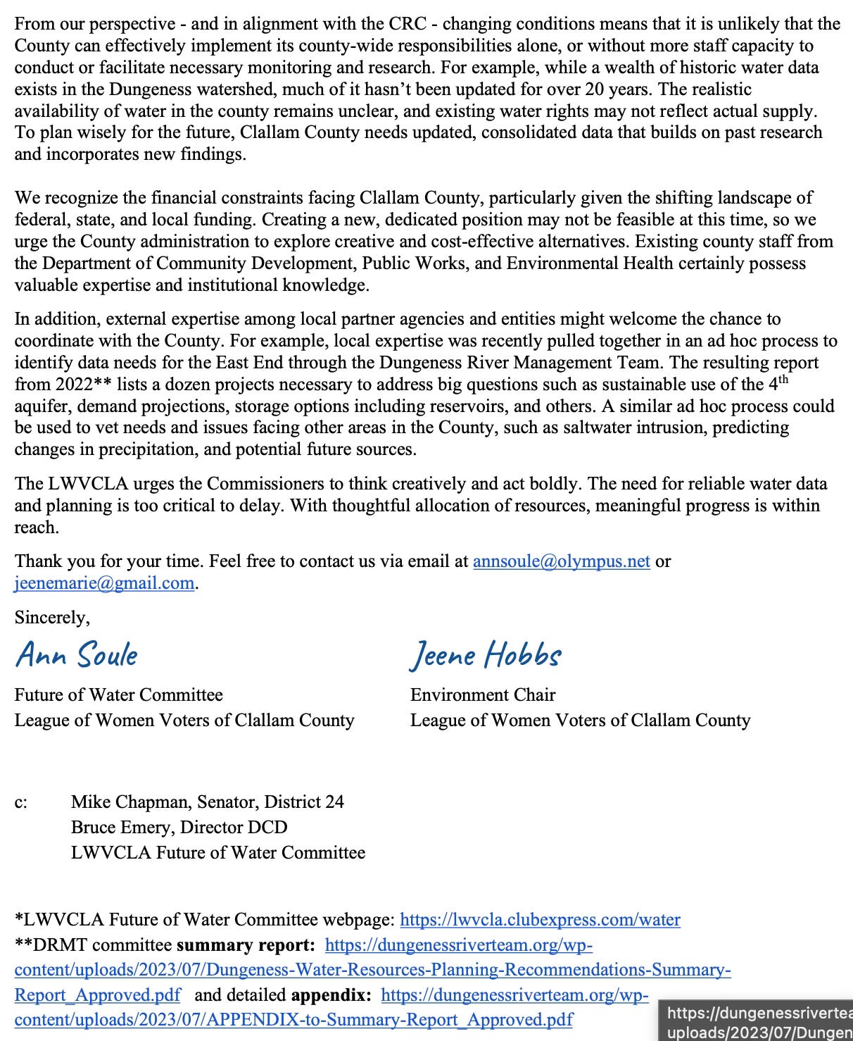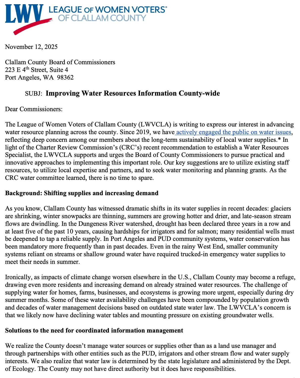 The Charter Review proposal to grow county government by creating a “Water Steward” position was overwhelmingly rejected by residents — 70% opposed it in the countywide survey. But the League of Women Voters of Clallam County is not finished. In a November 12 letter to the Board of Commissioners, the LWV urges renewed action, repeating climate and resource warnings and calling the position too important to abandon.