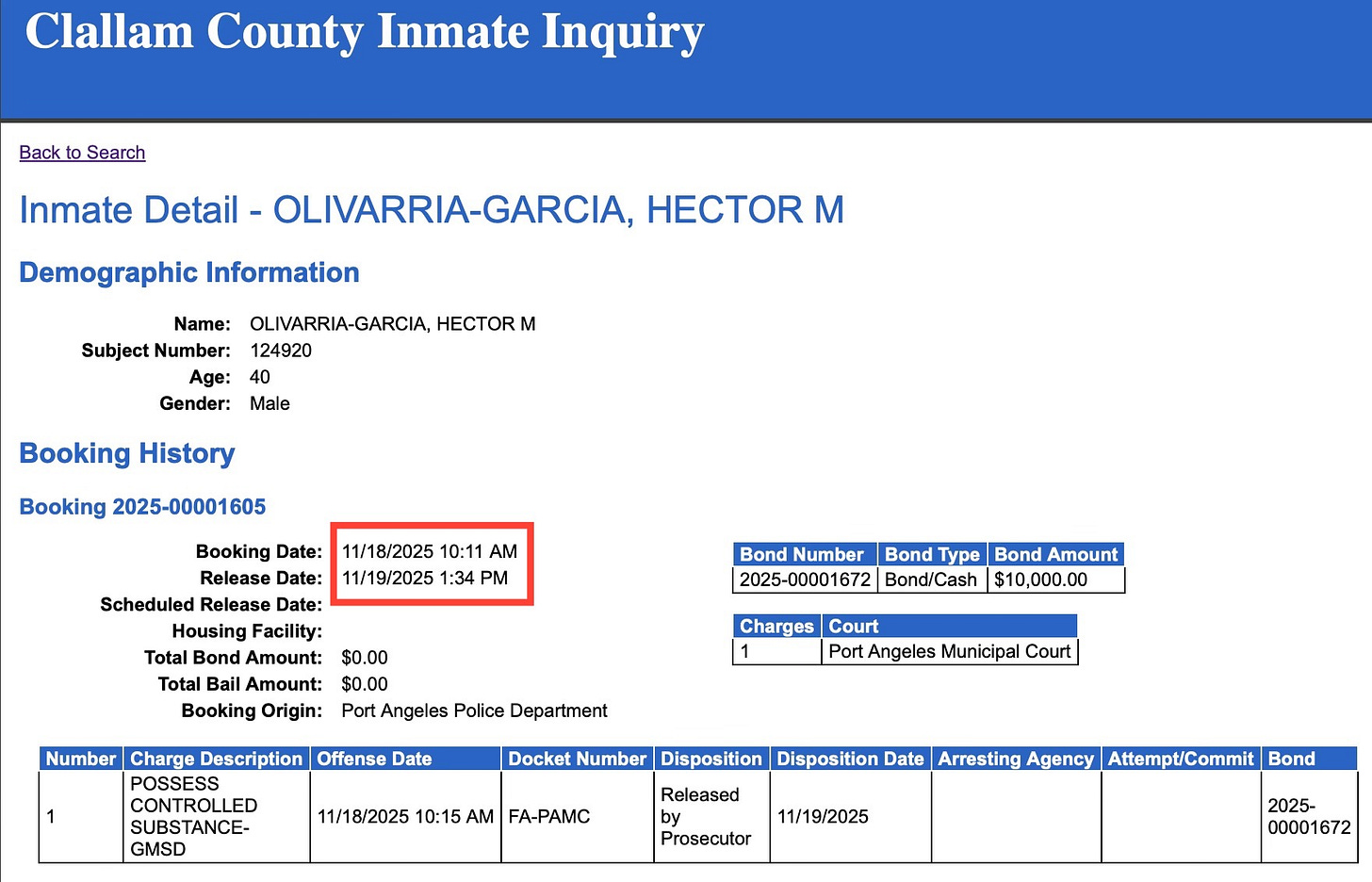 Yesterday’s report on serial offender Hector Olivarria Garcia is growing more concerning as details emerge. Garcia has cycled through multiple Washington counties — King, Thurston, Grays Harbor, and now Clallam — on a steady rotation of criminal charges. Records show he was in King County courts throughout 2023, jailed in Grays Harbor in April, and recently picked up in Port Angeles for drug possession.