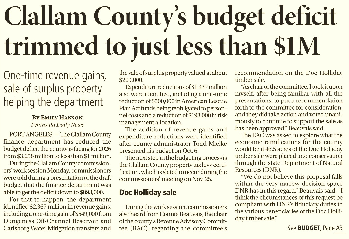 Not long ago, Administrator Todd Mielke warned that Clallam County’s nearly $4 million deficit might require cutting 20–25 positions. Then, through cost-cutting and new revenue streams, the deficit shrank to $2 million — but voters were still told that failure to pass a $3.75 million property tax hike would endanger public safety, election integrity, and public health.