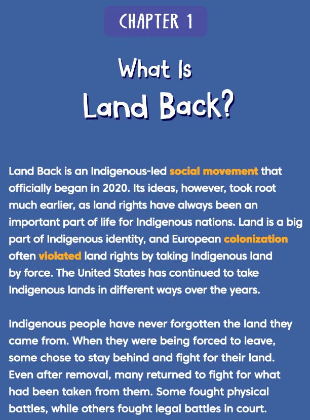 The opening chapter defines Land Back as an “Indigenous-led social movement” rooted in the idea that European colonization forcibly took land.