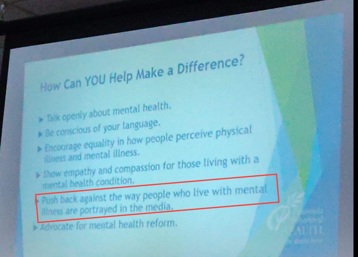 On PBH’s slide titled “How can you help make a difference?” the audience was urged to push back on how individuals with mental illness are portrayed in the media.