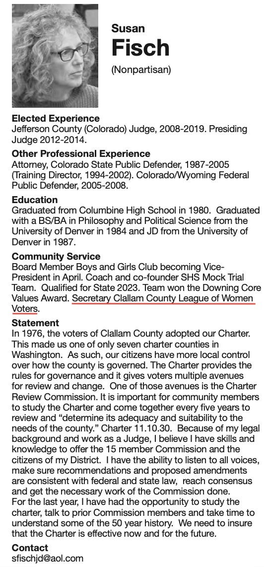 The 2025 Charter Review Commission was a case study in selective democracy. Susan Fisch, who identified herself in the voter pamphlet as Secretary of the League, rode that trusted, nonpartisan reputation to receive the highest vote total of any Charter Review Commissioner—and ultimately became chair.