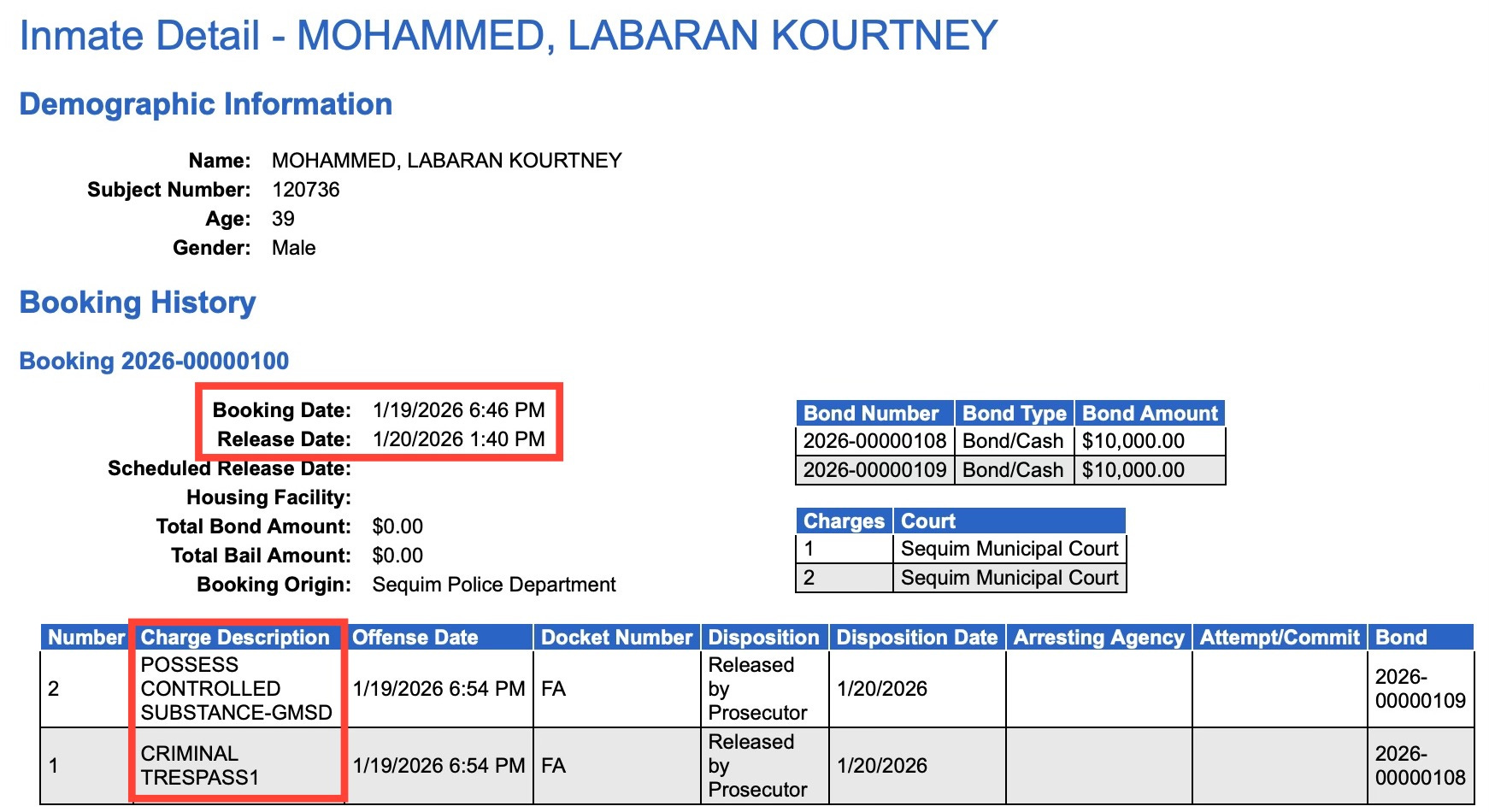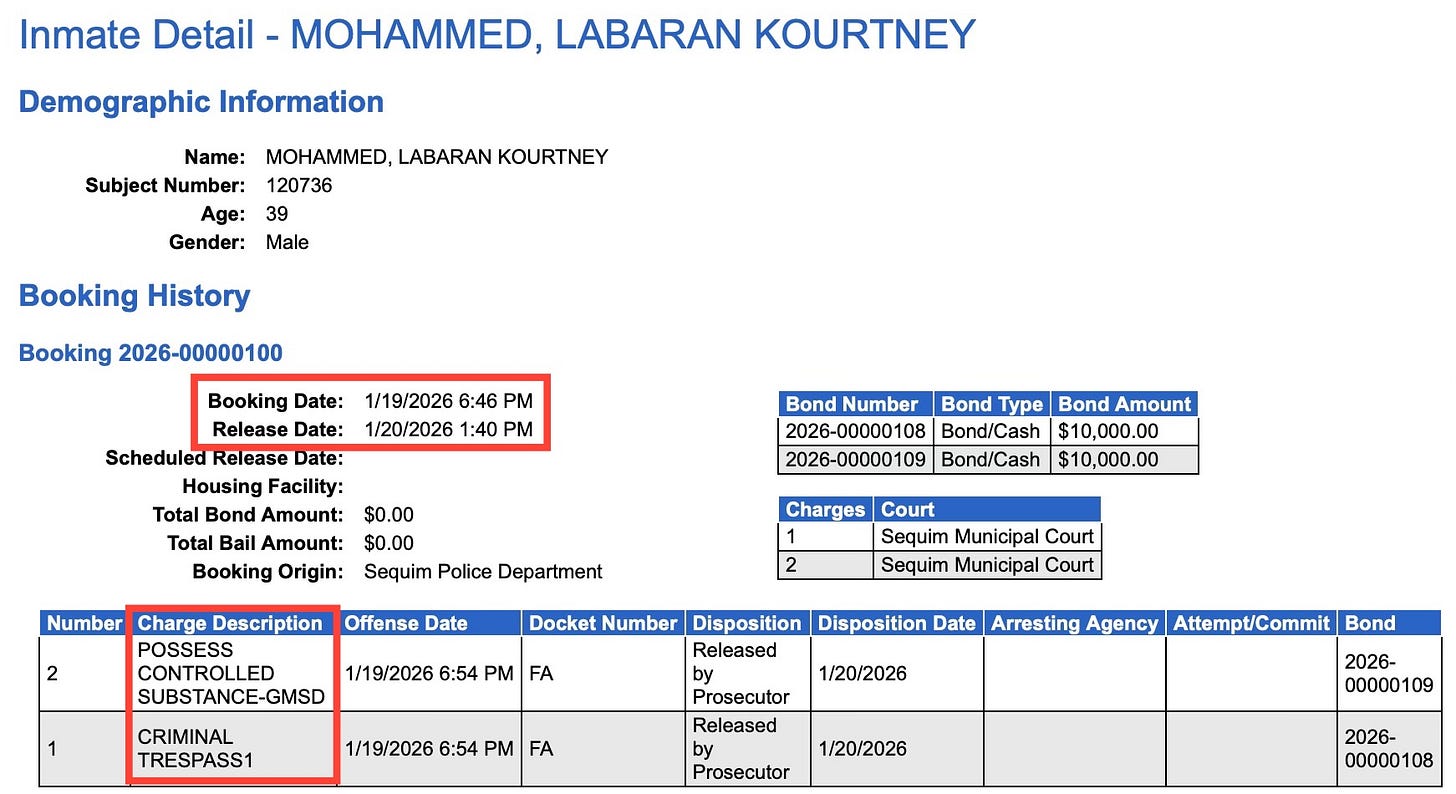 Labaran Kourtney Mohammed was booked into Clallam County jail on January 19 for possession of a controlled substance and criminal trespass — and released by the prosecutor the very next day.