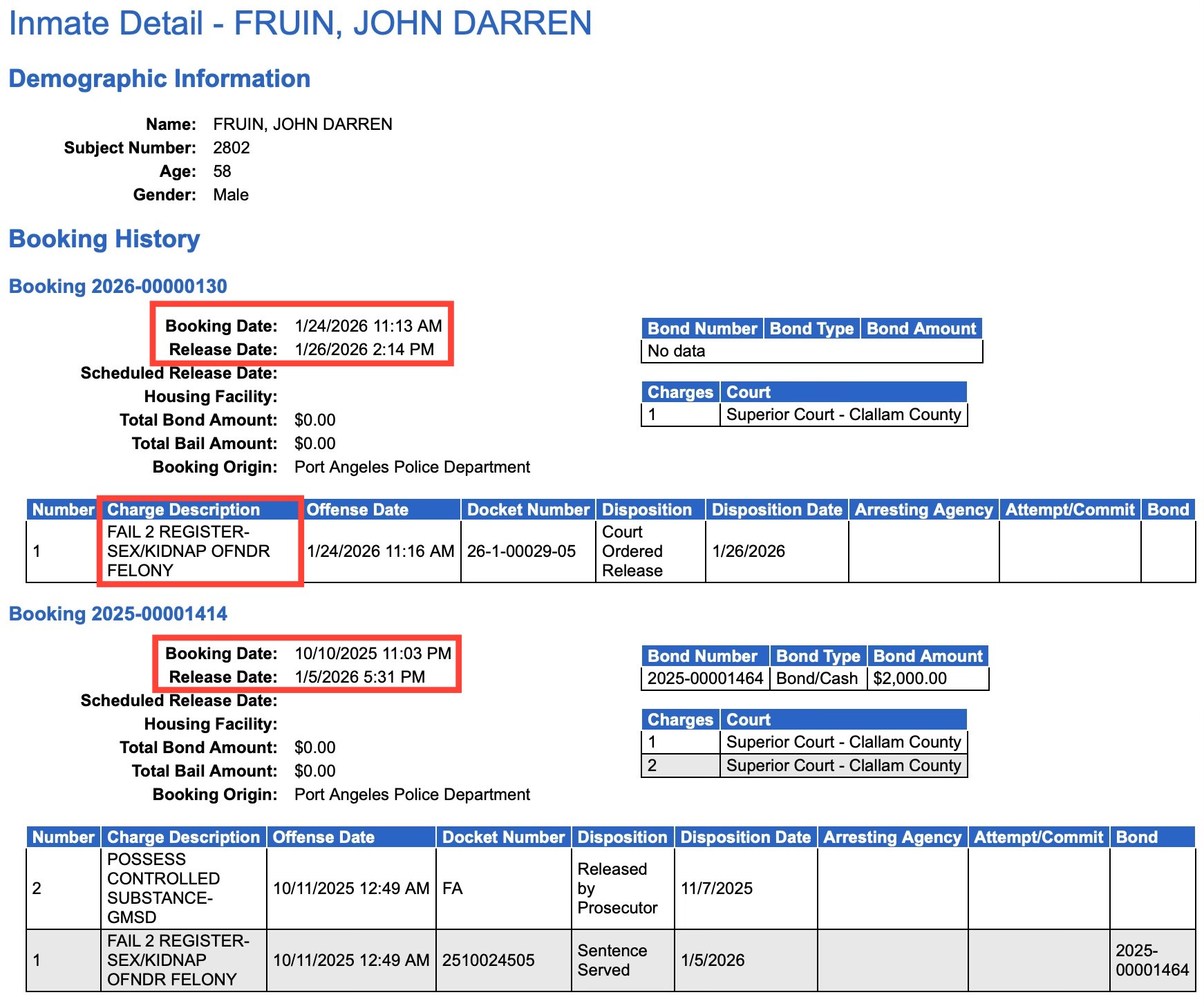 Remember John Fruin — the out-of-state sex offender from Oregon who landed in Clallam County jail in October on failure-to-register and drug possession charges.