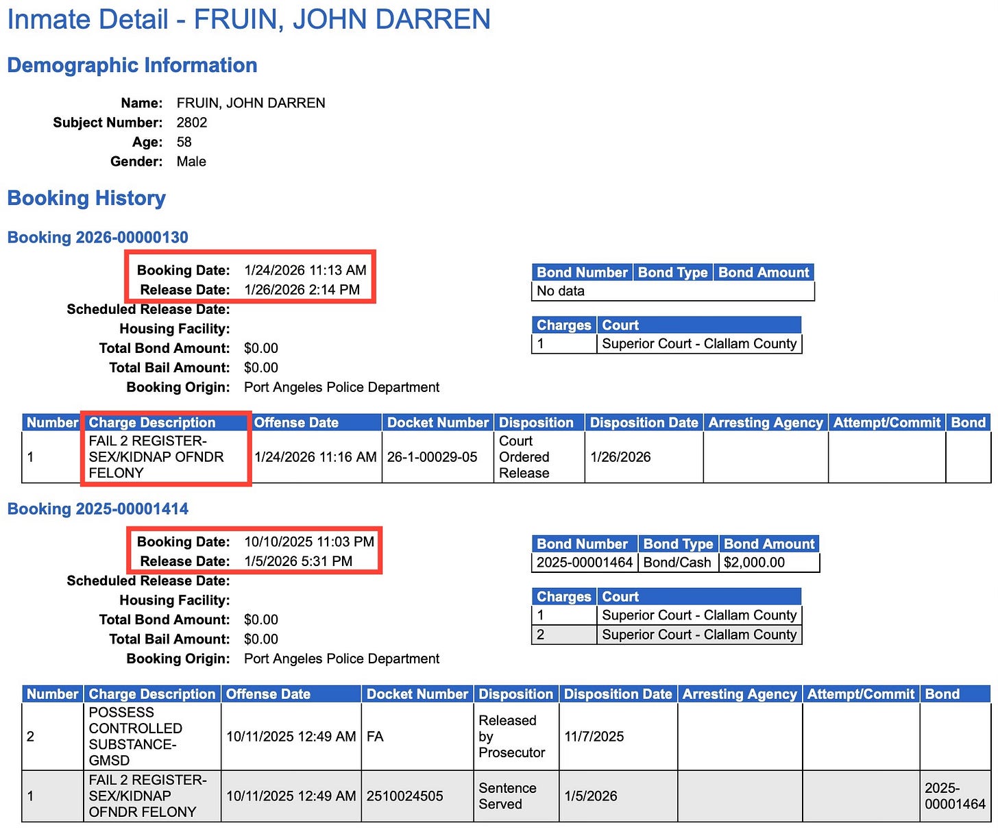 He was released on January 5, then booked back into Clallam County jail on Saturday on felony failure-to-register sex offender charges — and released again yesterday.