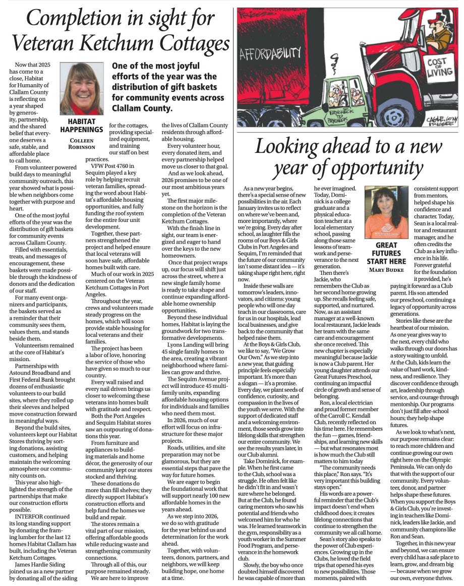 The CEO of Habitat for Humanity of Clallam County recently authored an article celebrating a housing milestone, yet nowhere did it disclose that she is the organization’s chief executive. An article praising the Boys & Girls Club of Sequim was written by Mary Budke — again, without identifying her as the CEO. These aren’t neutral observers; they are recipients of public money shaping the narrative about themselves.