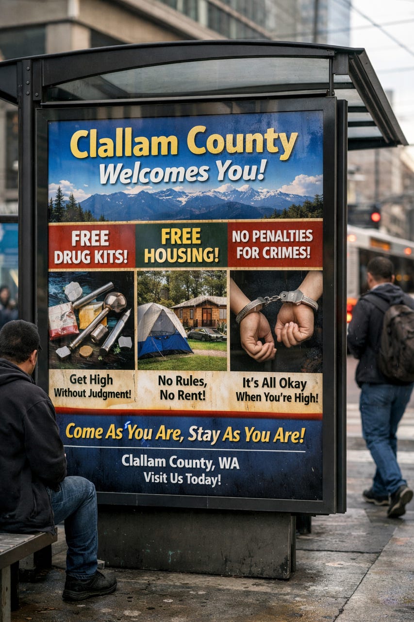 Clallam County increasingly looks less like a community and more like a landing zone — a place where repeat offenders learn the system is permissive, consequences are brief, and services are plentiful. Whether Appleby stays or moves on, the pattern is the same: the county absorbs the cost, the disruption, and the risk — while officials tell residents this is “working.”