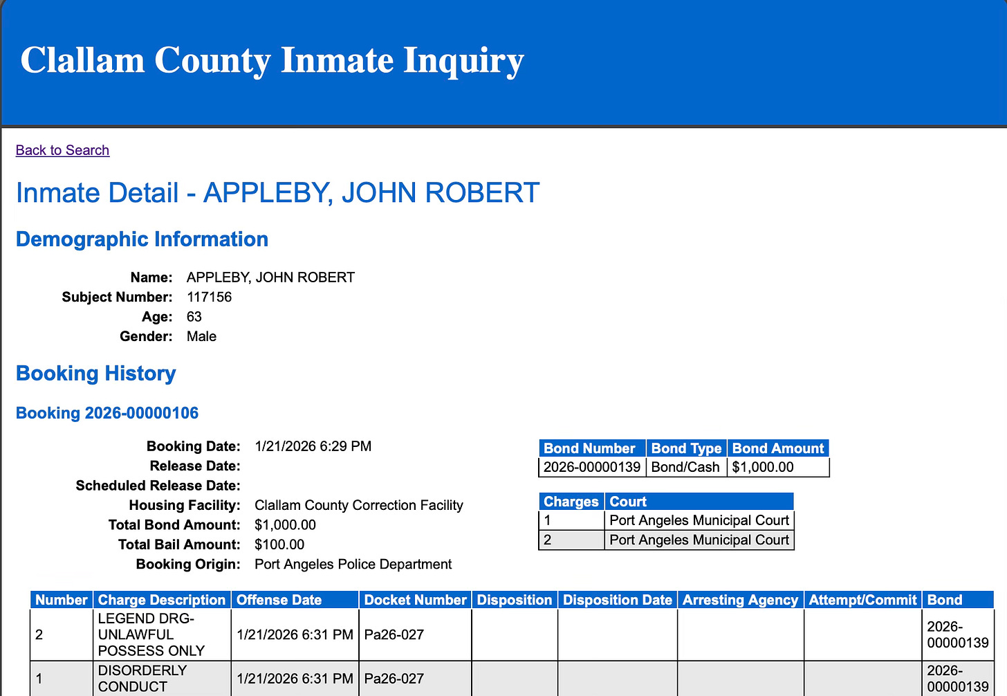John Robert Appleby, age 63, was booked into Clallam County Jail last week for unlawful drug possession and disorderly conduct.