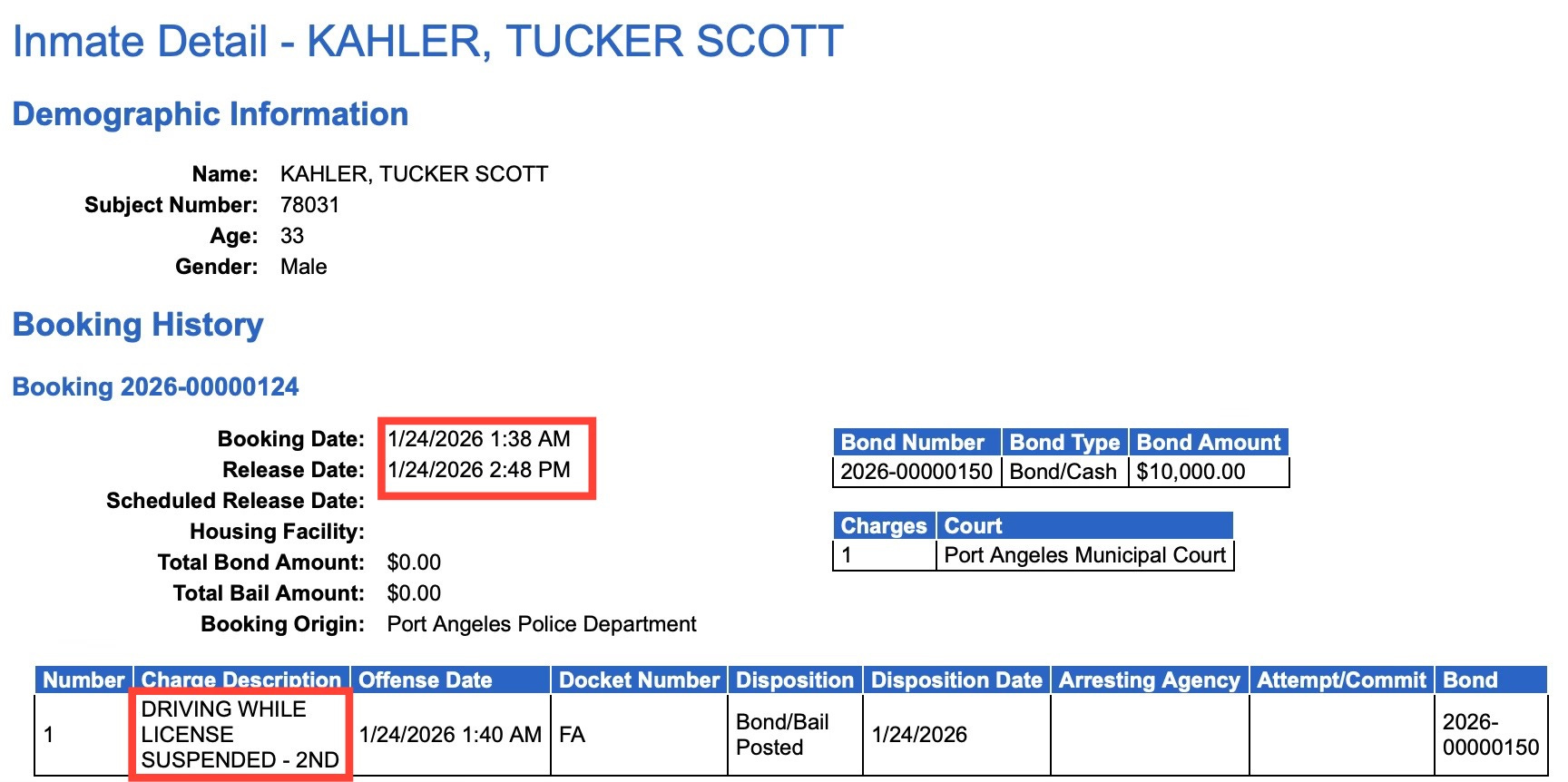 Tucker S. Kahler’s name is back in the recent booking-and-release churn — most recently booked and released the same day on a suspended-license charge.