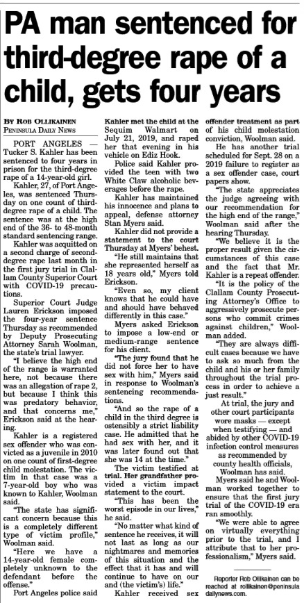 Here’s the context the public deserves to remember: in September 2020, Kahler was sentenced to four years in prison for third-degree rape of a child (a 14-year-old).