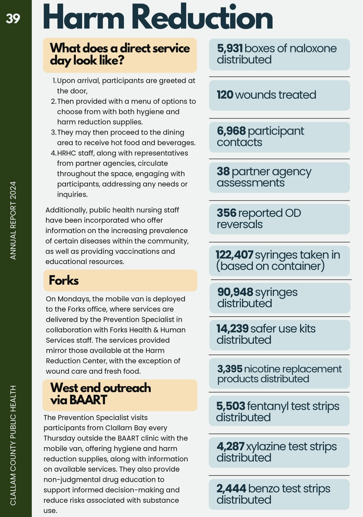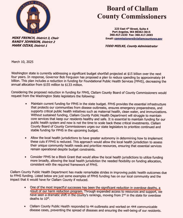 Additionally, a March 10, 2025 draft letter from the commissioners to the state legislature pleads for the continuation of Foundational Public Health Services (FPHS) funding in the wake of federal cuts. Although the draft was tabled pending further clarity from Olympia, it clearly states the commissioners’ position that harm reduction is responsible for the 2024 decline in Clallam County overdose deaths: