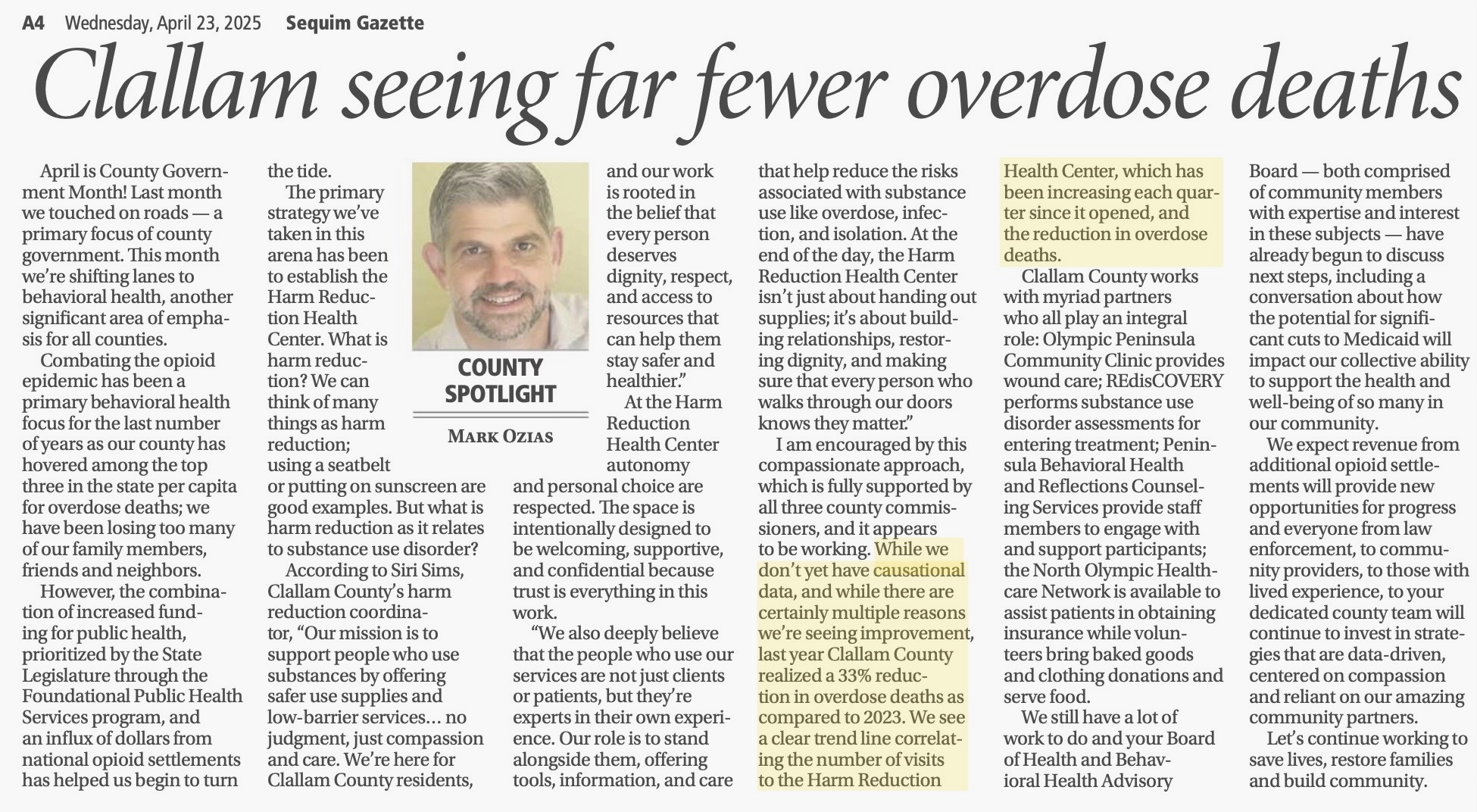 After an unexpected drop in overdose deaths in 2024, Commissioner Ozias penned an op-ed for an April 2025 issue of the Sequim Gazette: