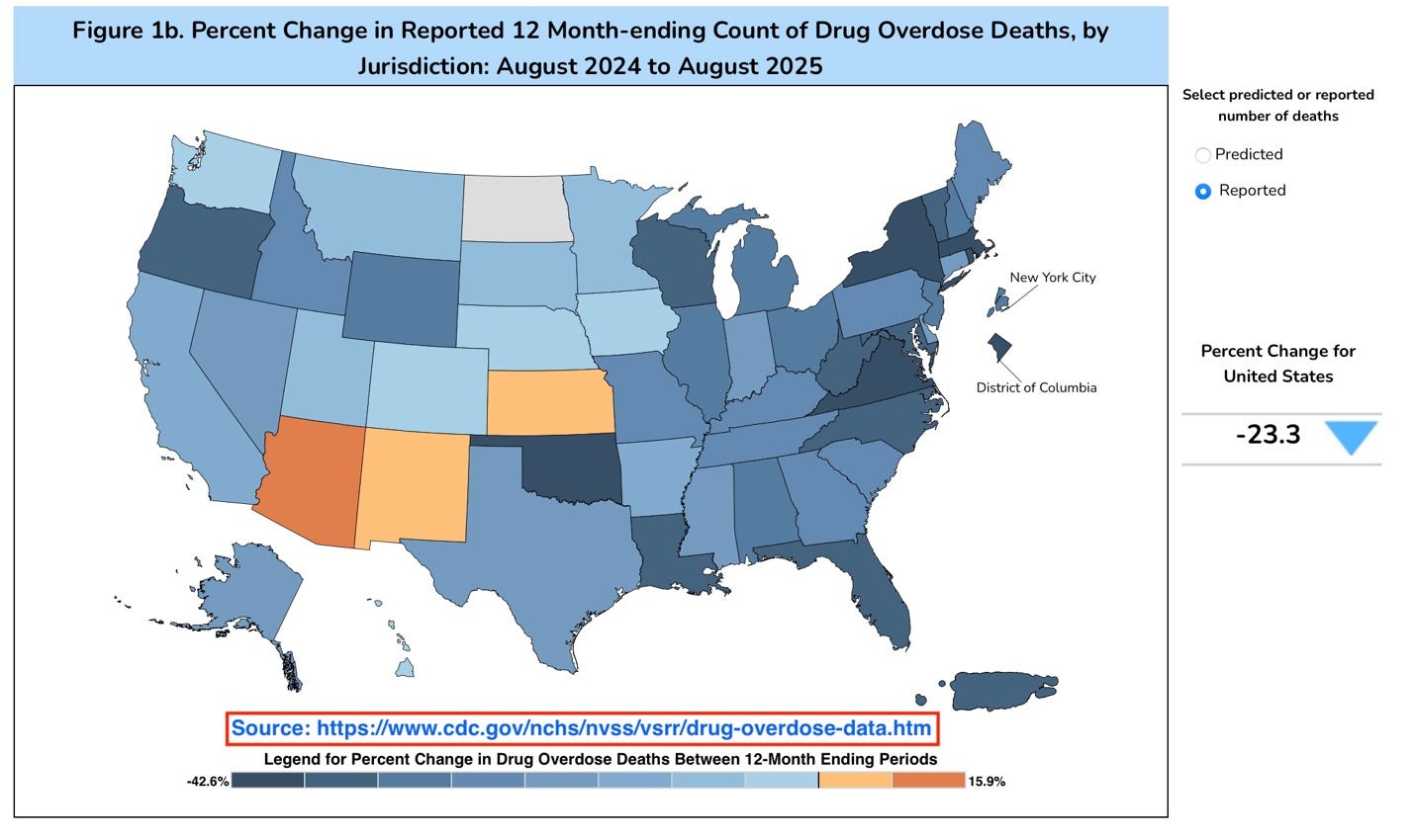 The CDC reports that U.S. overdose deaths dropped by 27% in 2024, followed by a further provisional decline of 23.3% for the 12-month period ending August 2025.