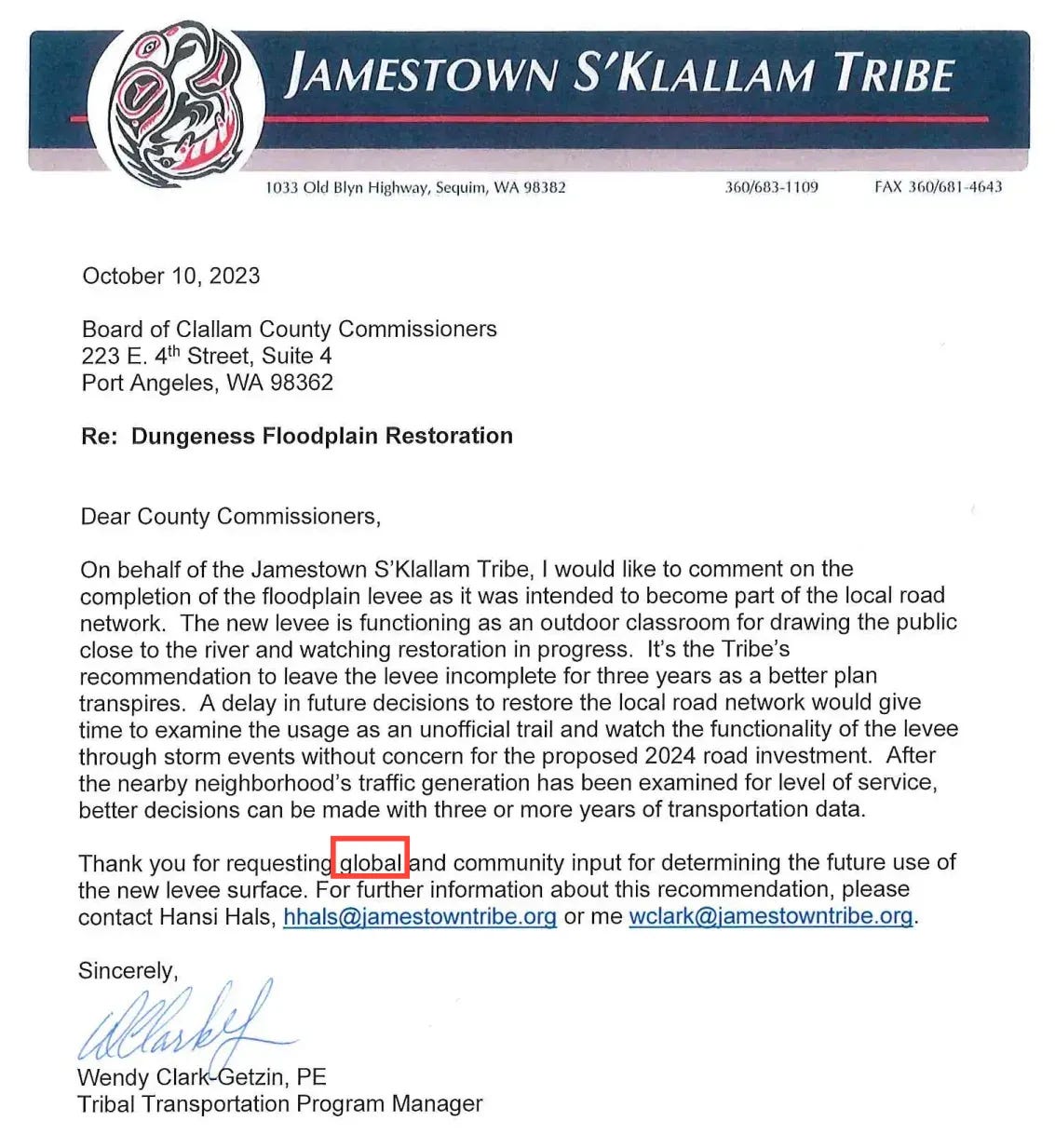 The significance of global influence to the Jamestown Tribe was evident in late 2023 when the Tribe thanked Clallam County Commissioners for “requesting global and community input for determining the future use of the new levee surface.” What global input was important in Clallam County deciding if a road owned and funded by county taxpayers would reopen?