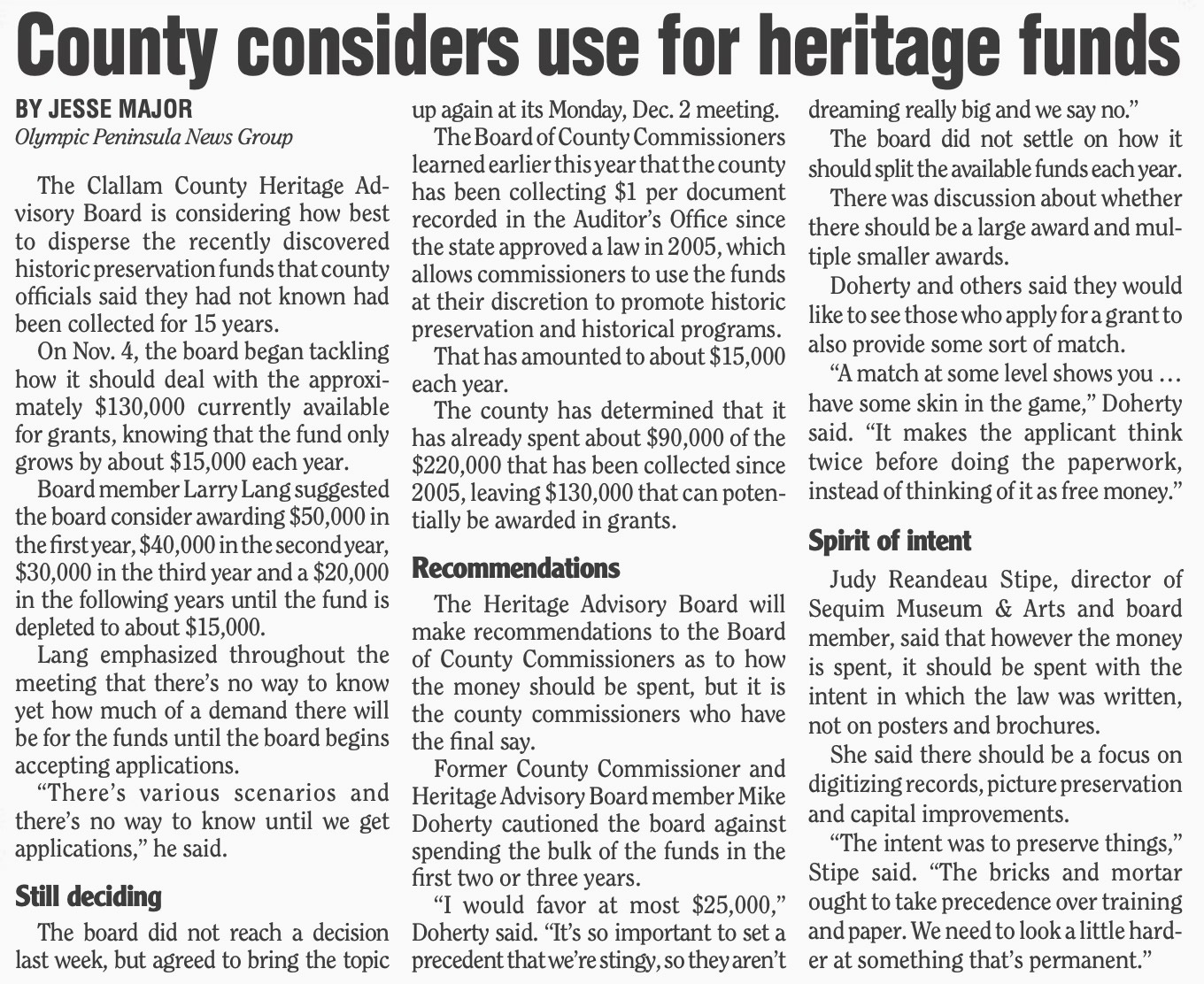 Stipe explained how the Heritage Advisory Board is funded — through one dollar from every $5 document recording fee, money the county had collected for 15 years without realizing it.