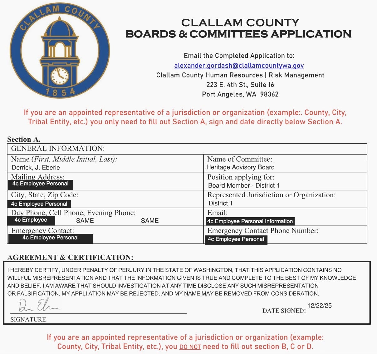Eberle works in Tacoma. He owns a home in Tacoma. He receives mail in Tacoma. His social media suggests his children attend school in Tacoma. Yet his application to the Heritage Advisory Board — a public record — has his mailing address redacted by the county.
