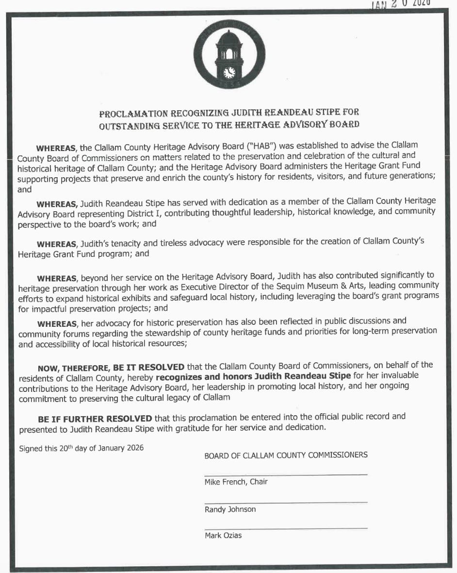Judith Reandeau Stipe — a Sequim resident and Executive Director of Sequim Museum & Arts, widely regarded as one of the most qualified individuals to ever serve on the Heritage Advisory Board.